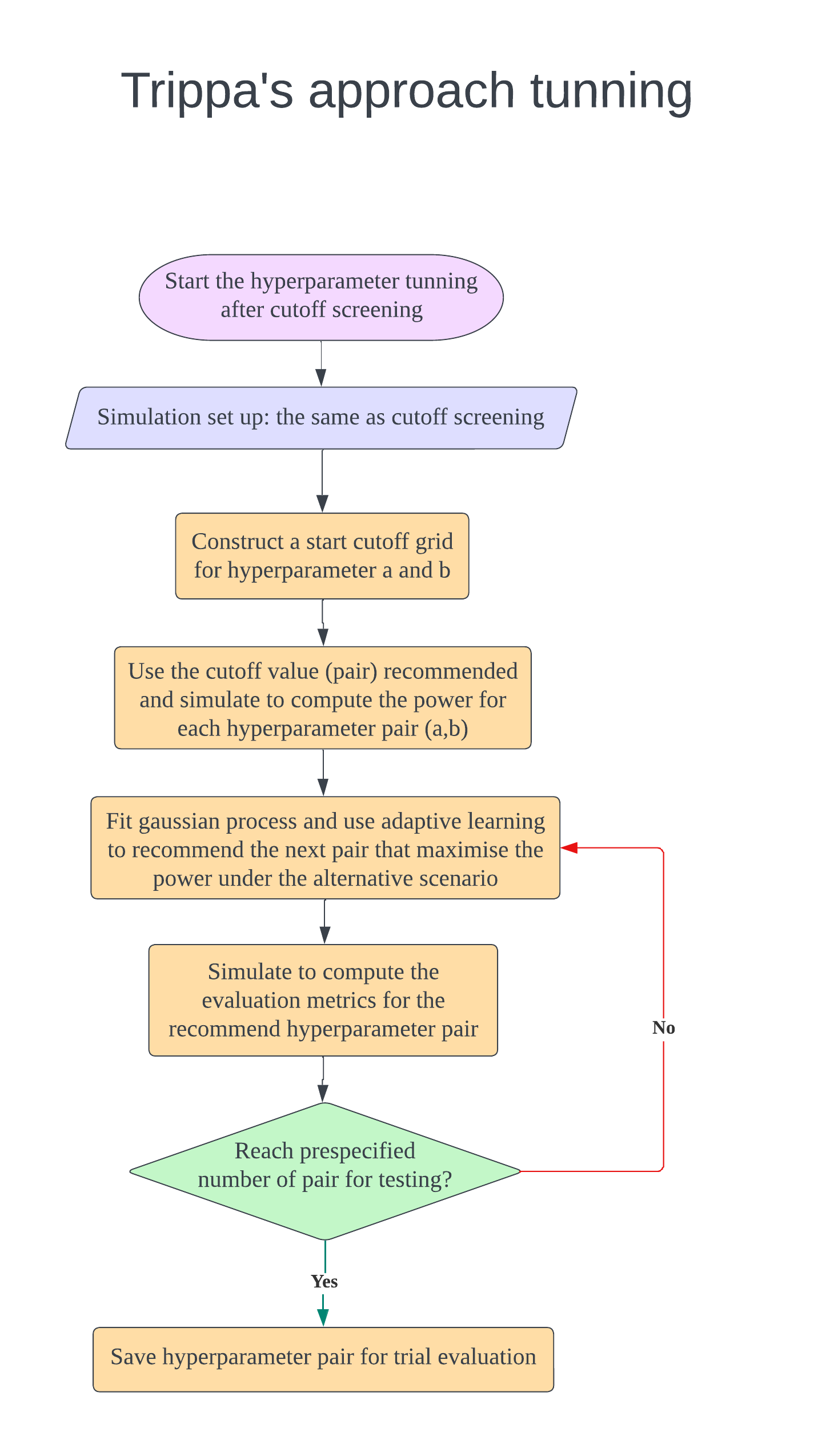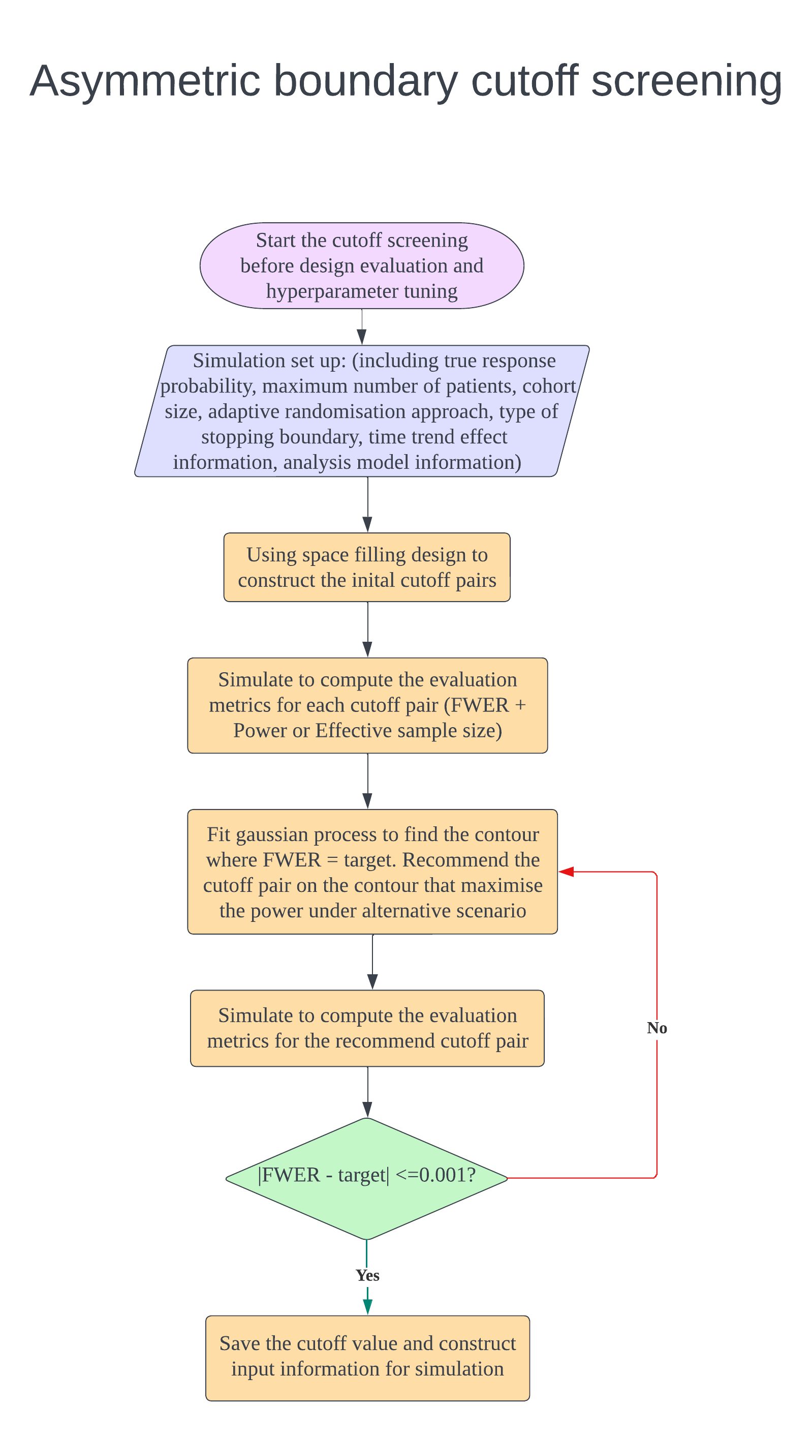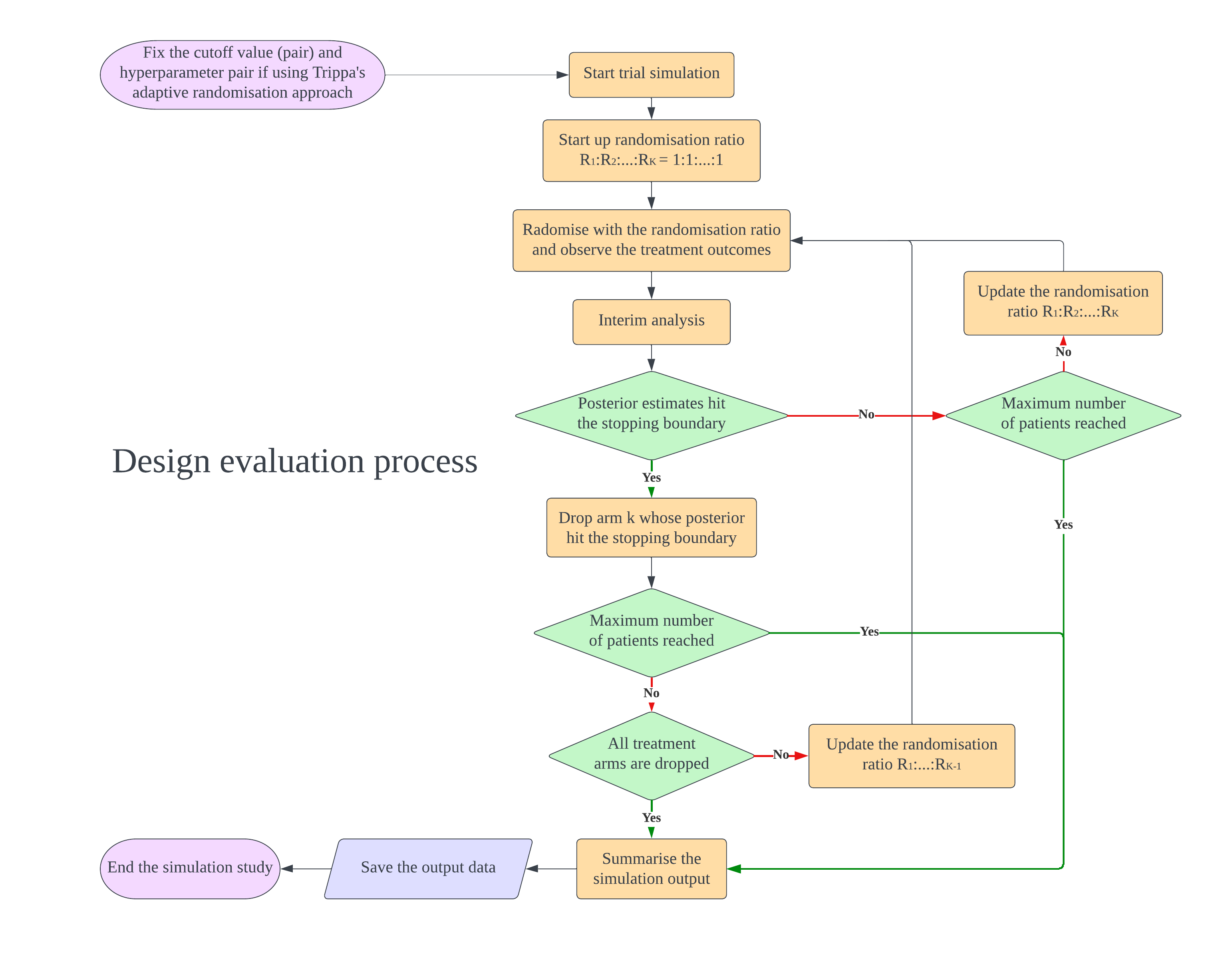 In the design, \(K\) intervention arms are evaluated compared to a shared control. During the trial, there are several interim analyses for decision making to claim superiority of each arm (Oneside test) or both inferiority and superiority of each arm (Twoside test). There are several parameters can be tuned which are cutoff values of stopping boundaries and the hyperparameters of Trippa’s adaptive randomisation approach. The below figures illustrate how to do design evaluation using this package. We need to set up the design first and start with cutoff screening to control the FWER and maximise the power. If the investigator want to tune hyperparameters of Trippa’s approach to maximise the power further, the randomisation method in cutoff screening process should be adaptive randomisation (Eg.Thall’s approach). We found that after fixing the cutoff value, the change of adaptive randomisation method does not inflate the FWER. After finding the cutoff (and hyperparameter), the design is fixed and can be evaluated. If investigator wants to compare the design with different maximum sample size, just use the same cutoff (and hyperparameter) and only change the sample size parameter to create a new design for evaluation.
