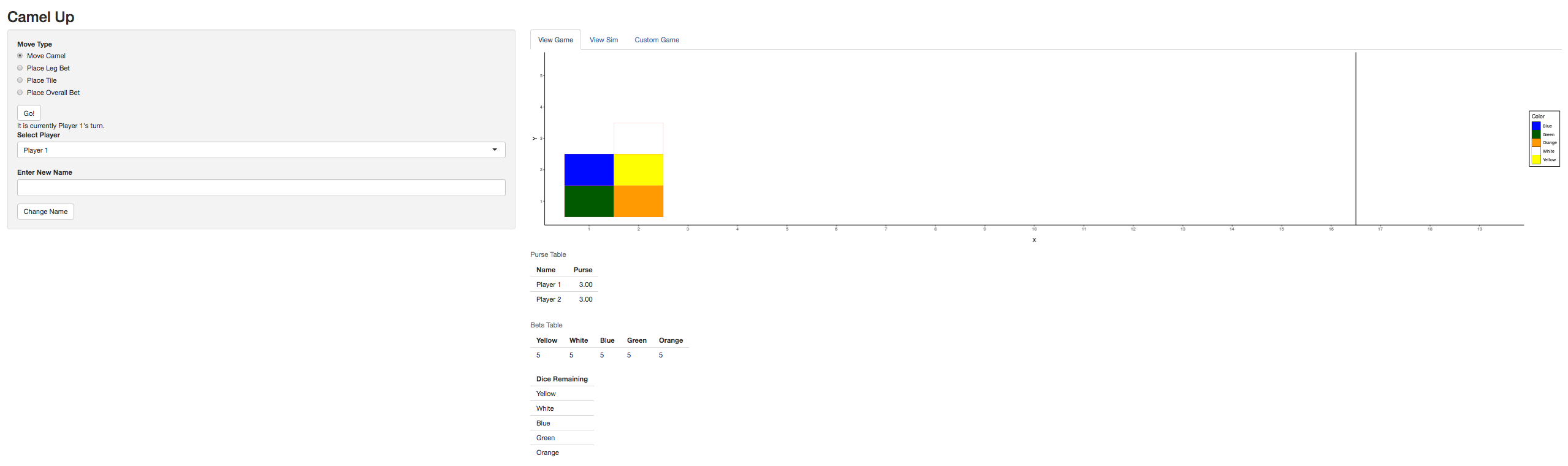 The goal of camelUp is to implement the board game CamelUp and include simulations to assist instruction in introductory statistics courses.