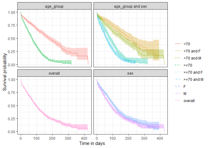 The package also allows to estimate survival of both an outcome and competing risk outcome together. We can then stratify, see information on events or summarise the estimates in the same way we did for the single event survival analysis.