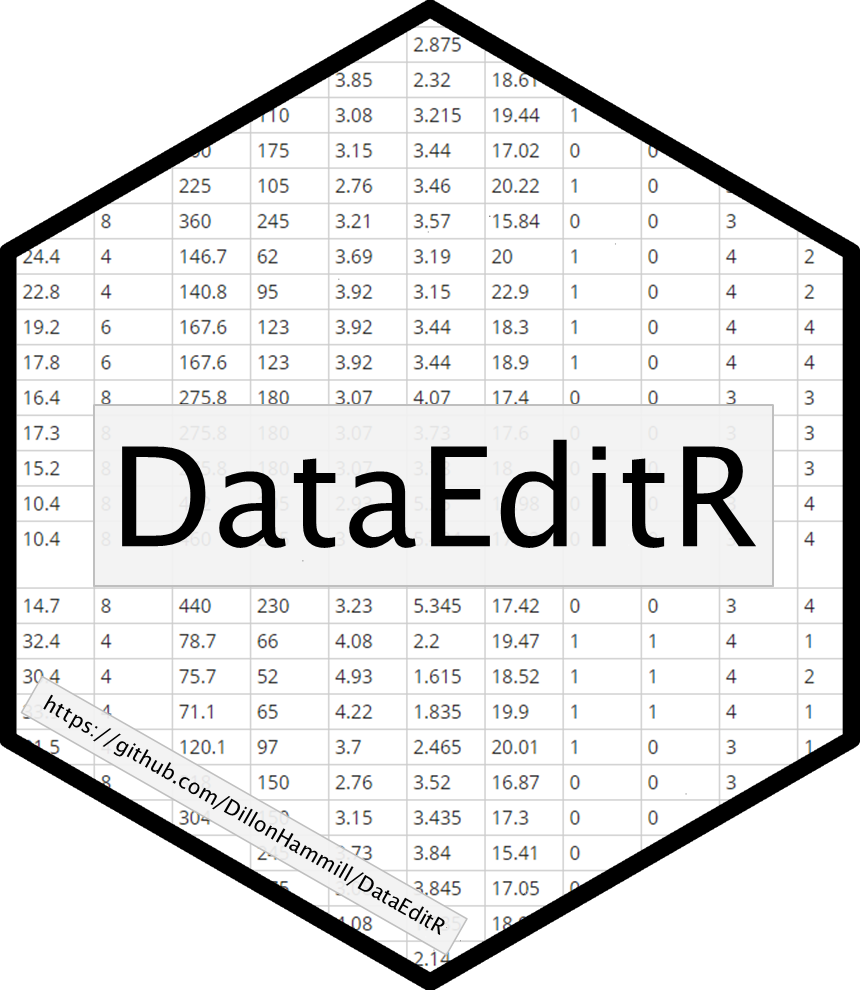 Manual data entry and editing in R can be tedious, especially if you have limited coding experience and are accustomed to using software with a Graphical User Interface (GUI). DataEditR is an R package built on shiny and rhandsontable that makes it easy to interactively view, enter, filter and edit data. If you are new to DataEditR visit https://dillonhammill.github.io/DataEditR/ to get started.