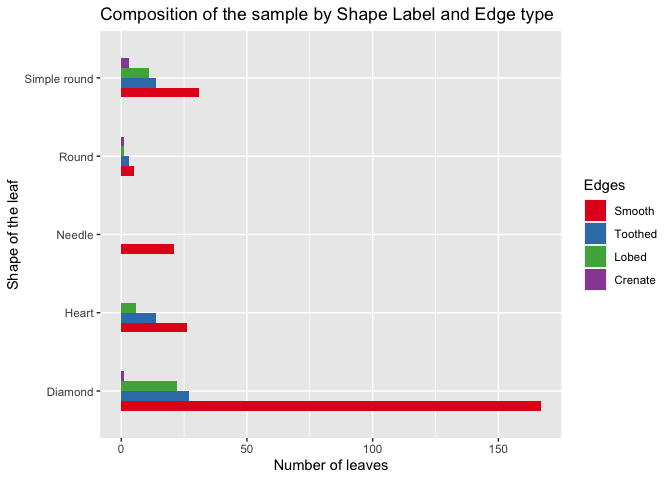 ggplot(d29, aes(fill = Edges, x=Shape , y=No_of_leaves)) + labs(y="Number of leaves", x="Shape of the leaf") + geom_bar(stat = "identity", width = 0.5, position = position_dodge()) + coord_flip() + ggtitle("Composition of the sample by Shape Label and Edge type") + scale_fill_brewer(palette = "Set1")