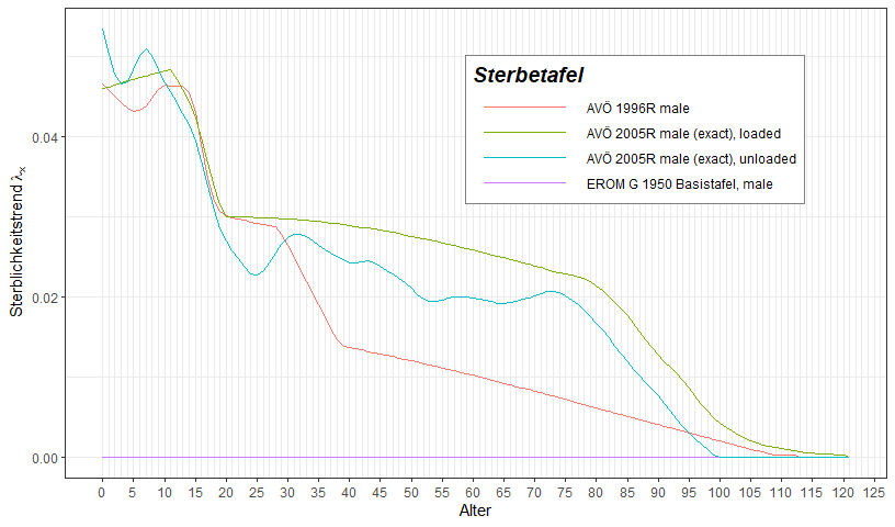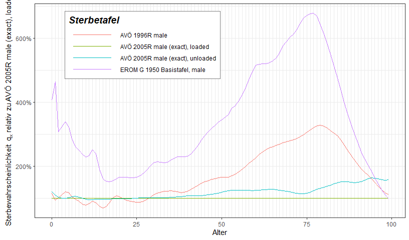 plotMortalityTables(AVOe2005R.male, AVOe2005R.male.unloaded, AVOe1996R.male, EROM.G1950.male,