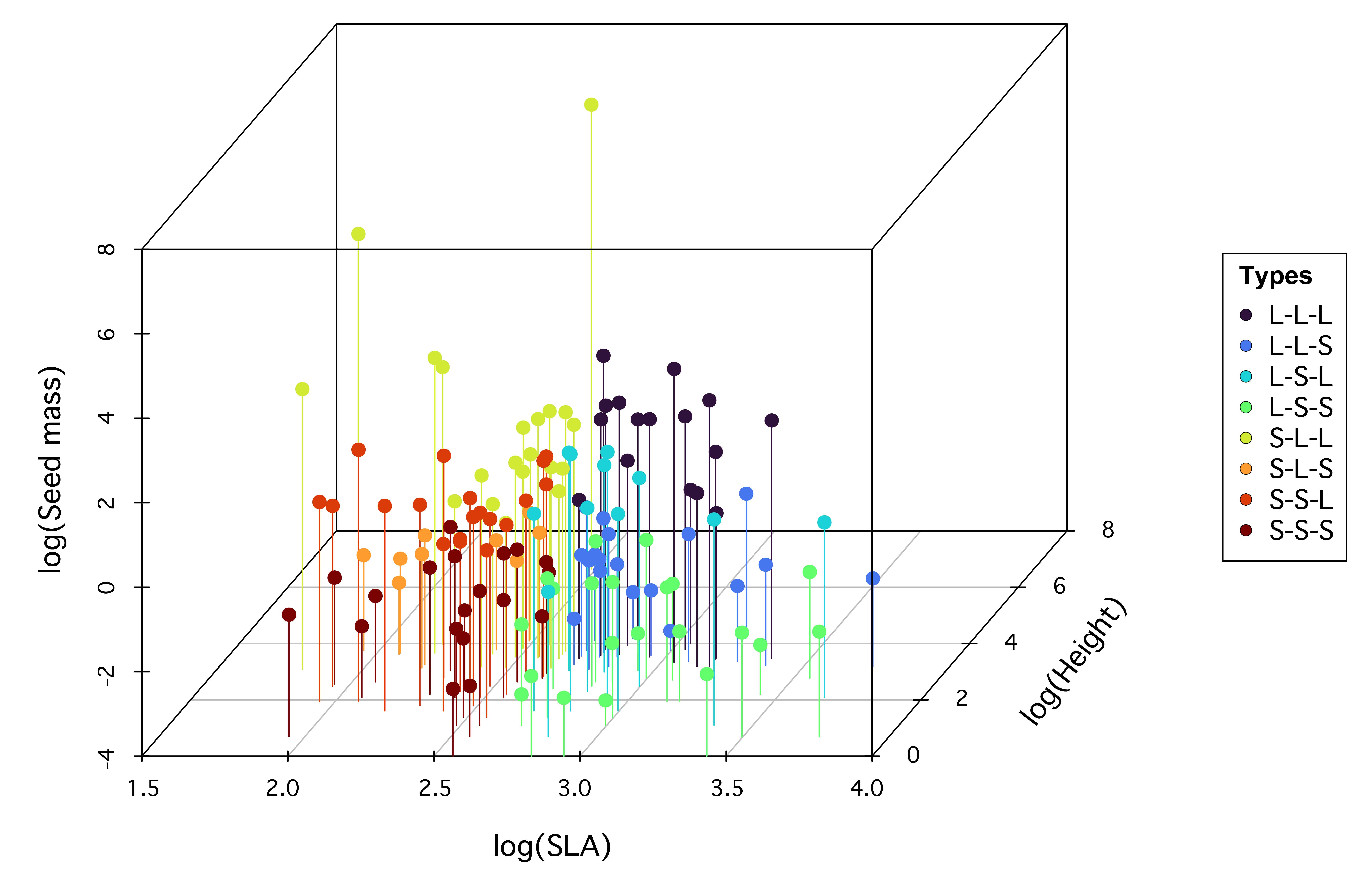 The Leaf--Height--Seed (LHS) scheme, proposed by Westoby (1998), classifies plant species based on specific leaf area (SLA), canopy height at maturity, and seed mass. These three traits reflect trade-offs in resource acquisition, spatial occupation, and reproductive investment. The MultiTraits package implements the LHS scheme by positioning species in a three-dimensional trait space using log-transformed trait values. This continuous space is then divided into eight discrete strategy types (e.g., S--S--S, L--L--L) based on median trait values, representing different trade-offs in growth, competition, and survival. The LHS_plot() function visualizes these strategies in 3D space, while LHS_strategy_scheme() provides a reference key for interpreting the strategy types.