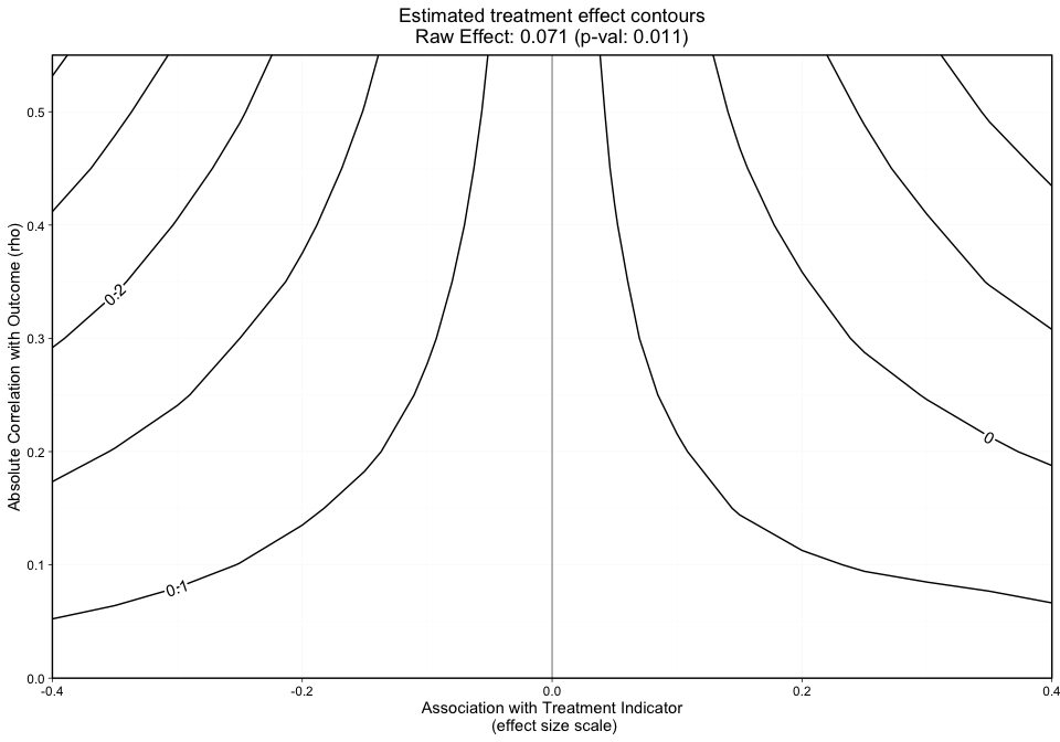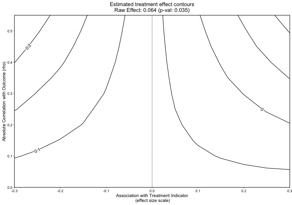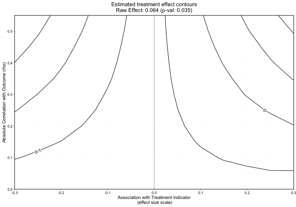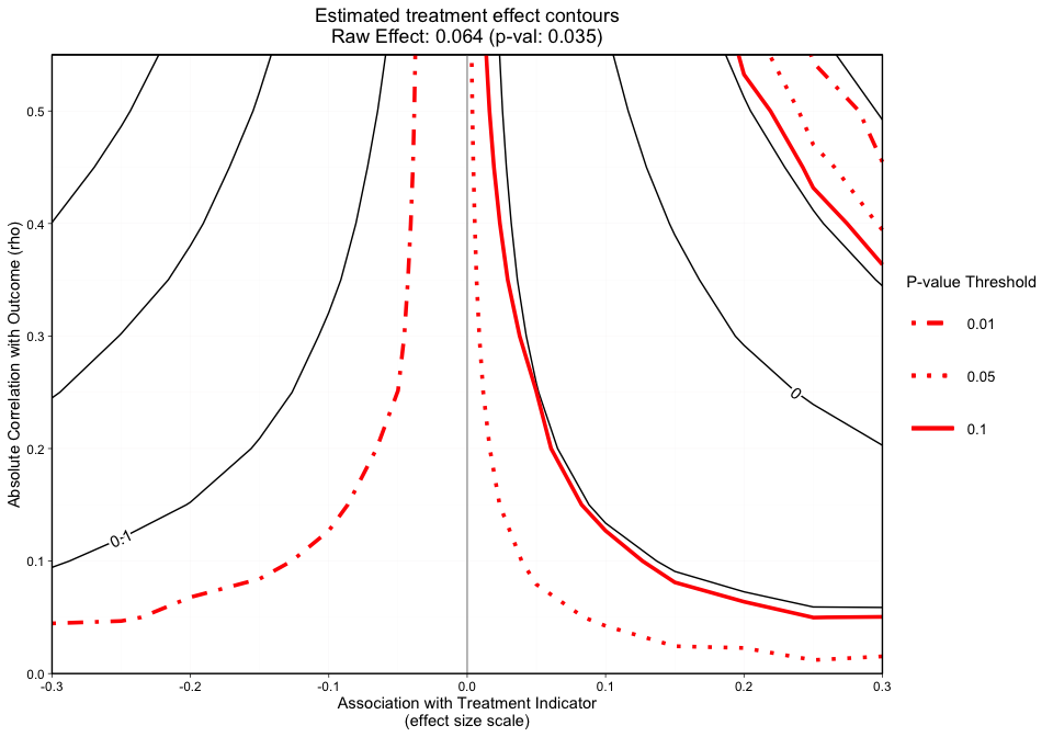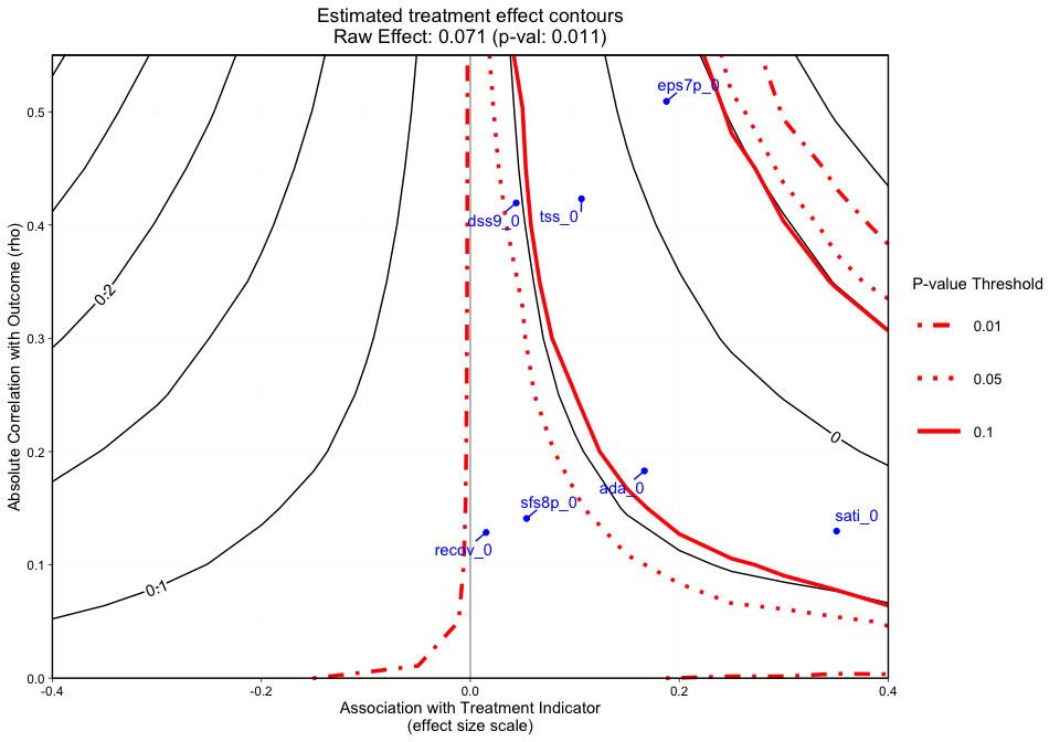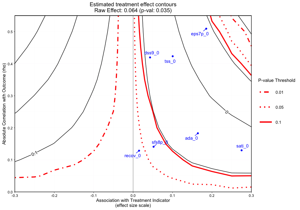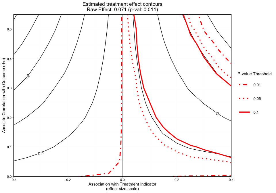 To review, the graphics visualize (1) treatment effect contours, (2) treatment effect contours in black and p-value contours in red, and (3) treatment effect and p-value contours with covariate labels added, respectively.