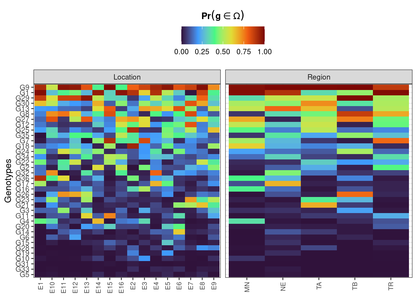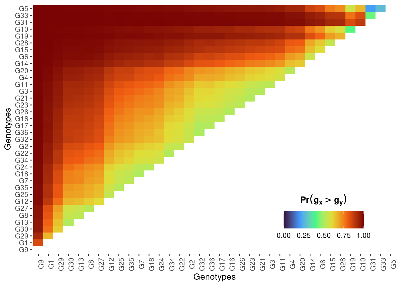 ProbBreed employs Bayesian statistics to analyse multi-environment trials’ data, and uses its outputs to estimate the marginal and pairwise probabilities of superior performance and superior stability of the genotypes, as well as their conditional probability of superior performance. The method is thoroughly described at https://doi.org/10.1007/s00122-022-04041-y.