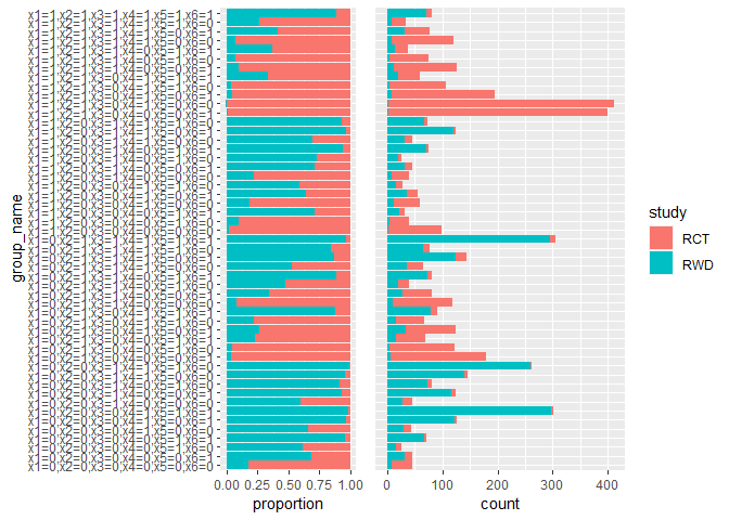 source.obj.rep$EstimateRep(stratification = c("x1","x3","x4","x5"))This step diagnoses model assumption for G-computation (covariats balance for IPW), treatment overlap assumption, outcome overlap assumption, and sampling overlap assumption.
