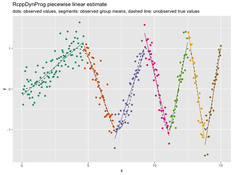 In the above we have an input (or independent variable) x and an observed outcome (or dependent variable) y_observed (portrayed as points). y_observed is the unobserved idea value y_ideal (portrayed by the dashed curve) plus independent noise. The modeling goal is to get close the y_ideal curve using the y_observed observations. Obviously this can be done with a smoothing spline, but let’s use RcppDynProg to find a piecewise linear fit.