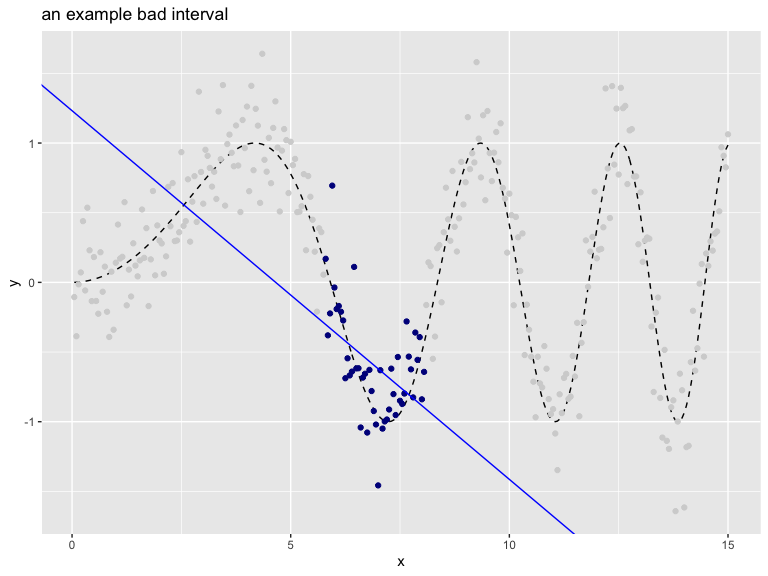 The following interval is a good interval, as all the chosen points (shown in dark blue) are in a nearly linear arrangement. The in-sample price of the interval would be the total sum of residuals of a linear model fit on the selected region (and the out of sample price would be given by the PRESS statistic).