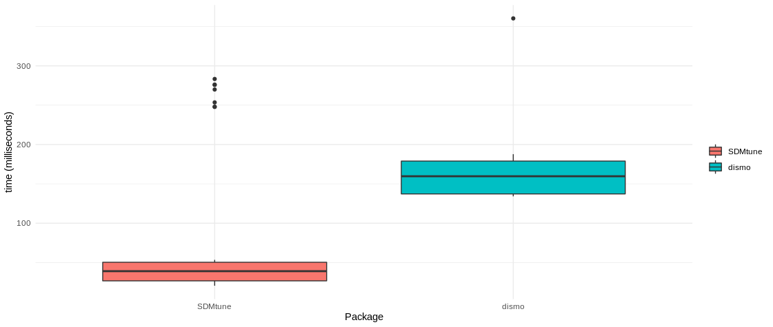 We compare the execution time of the predict function between SDMtune that uses its own algorithm and dismo (Hijmans et al. 2017) that calls the MaxEnt Java software (Phillips, Anderson, and Schapire 2006). We first convert the object sdmtune_model in a object that is accepted by dismo: