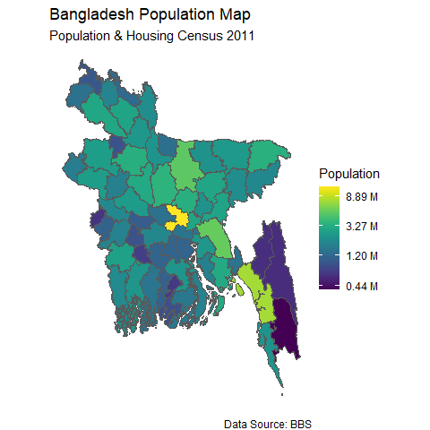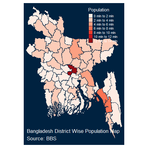 The bangladesh package provides ready-to-use shapefiles for different administrative regions of Bangladesh (e.g., Division, District, Upazila, and Union). Usually, it is difficult to plot choropleth maps for Bangladesh in R. This package will help users to draw thematic maps of administrative regions of Bangladesh easily as it comes with the sf objects for the boundaries and regions’ names in English. It also provides functions allowing users to efficiently get specific area maps and center coordinates for regions. Users can also search for a specific area and calculate the centroids of those areas.