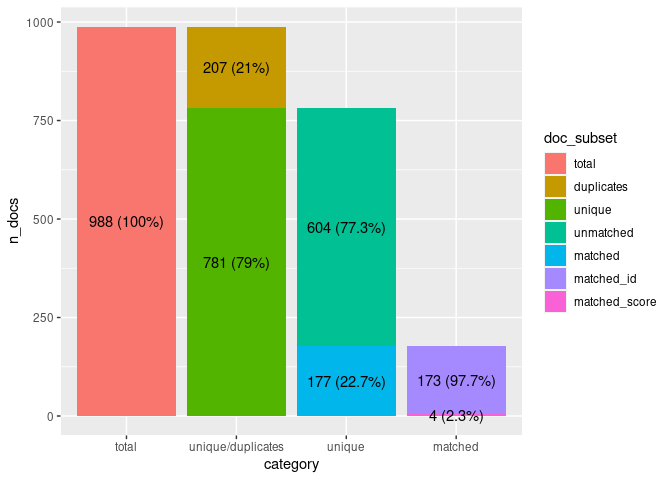 The package also features some functions for plotting the results of biblioverlap(). For instance, the plot_matching_summary() function can be used to convert the summary of the matching procedure into a bar plot.