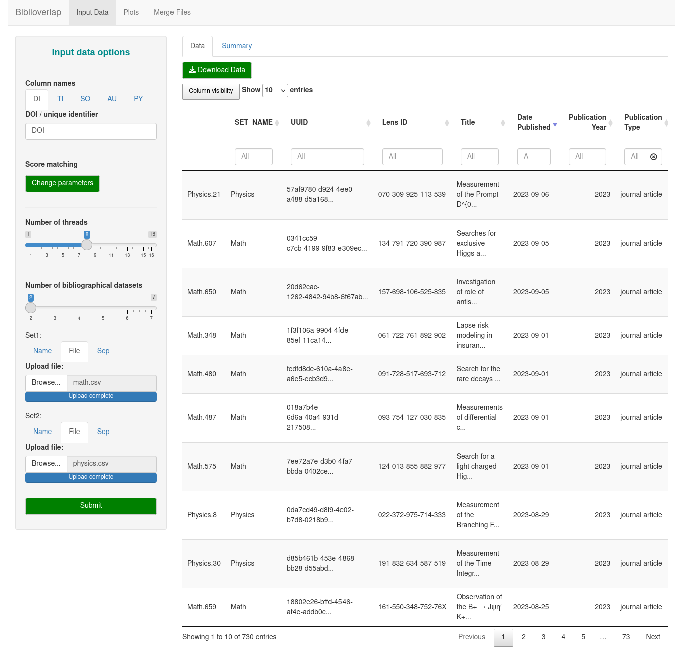 The biblioverlap package also features a graphical user interface in the form of a ShinyApp, which can be called through the biblioverApp() function.