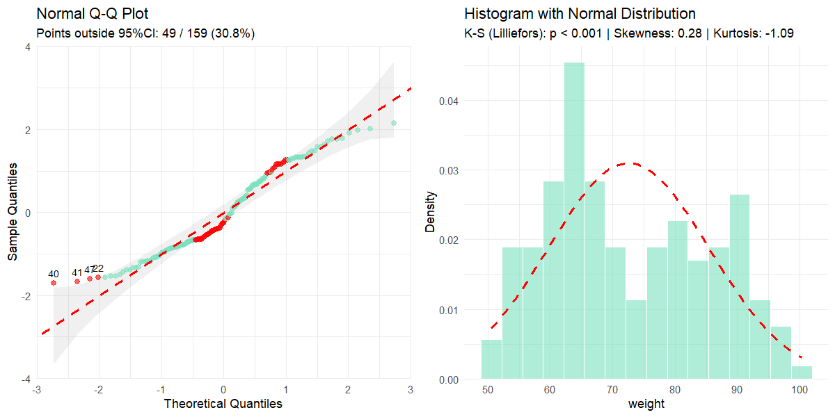 Character string indicating the normality test to use: ‘S-W’ for Shapiro-Wilk or ‘K-S’ for Kolmogorov-Smirnov test with Lilliefors’ correction. | 'S-W' |