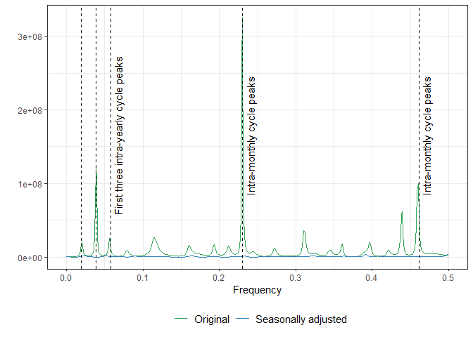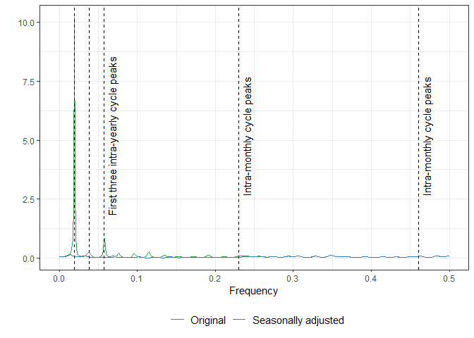Following a thorough visual examination of the seasonally adjusted data, we can now move forward with the spectrum diagnostics. As illustrated in the Figure below, corroborating our initial analysis of potential underlying seasonal patterns, it becomes evident that the data has two distinct seasonal cycles. Additionally, it is noteworthy that our procedure successfully removed the corresponding peaks, thereby highlighting its effectiveness.