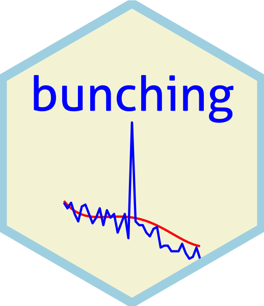 bunching allows the user to conduct bunching analysis in a kink or notch setting and returns a rich set of results. Important features of the package include functionality to control for (different levels of) round-number bunching or other bunching masses within the estimation bandwidth, options to split bins by placing the bunching point as the minimum, median or maximum in its bin (for robustness analysis), and produces estimates of both parametric and reduced-form versions of elasticities associated with the bunching mass. It also returns (residual-based) bootstrapped vectors of estimates of all the main estimable parameters (bunching mass, elasticity, marginal buncher, dominated region, fraction in dominated region in notch setting, etc.) which can be used for further analysis, e.g. incorporation into structural models that rely on bunching moments. The package also provides an exploratory viusalization function to speed up pre-analysis, and produces plots in the Chetty et al. (2011) style with lots of options on editing the plot appearance.