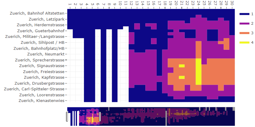 This package is originally being developed for Verkehrsbetriebe Zürich (VBZ), the public transport operator in the Swiss city of Zurich, to illustrate the utilization of different routes and vehicles during different times of the day. Therefore, it groups utilization data (e.g. persons per m^2) into different categories (e.g. low, medium, high utilization) and illustrates it for certain stops over time in a heatmap.