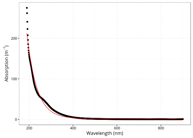 ## [4] "spectra"The cdom_fit_exponential() function fits an exponential