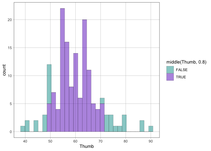 gf_histogram(~Thumb, data = Fingers, fill = ~ middle(Thumb, .80))