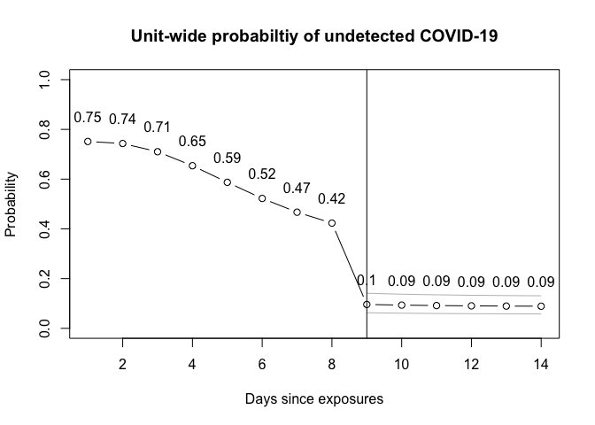 This package provides the functions, data and documentation that support a calculator to determine the probability of an undetected COVID-19 infection in a setting/unit after a potential exposure, testing, and when there are no symptomatic cases. For a detailed explanation of the rationale and implementation, please see the vignette.