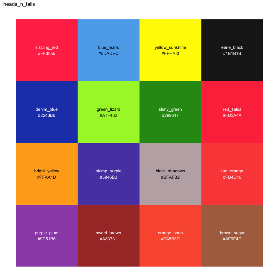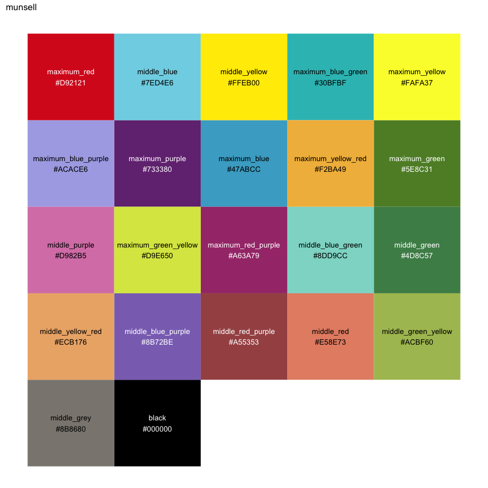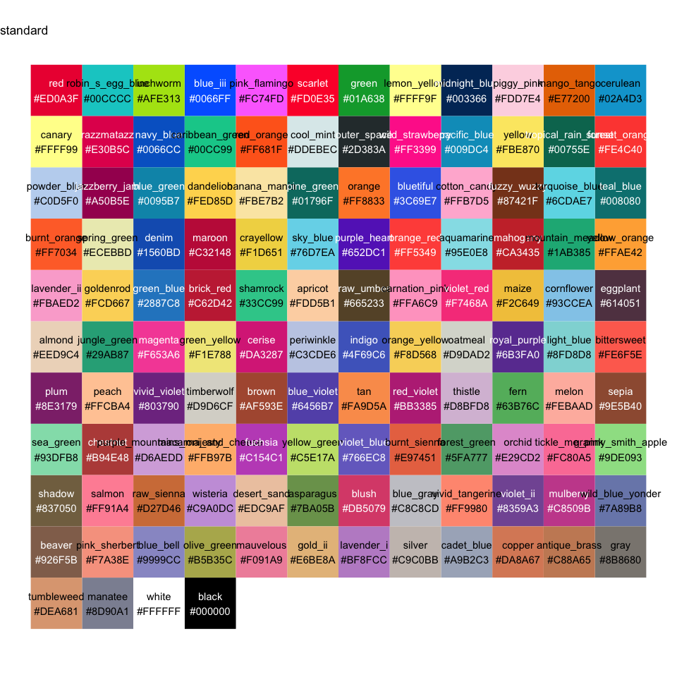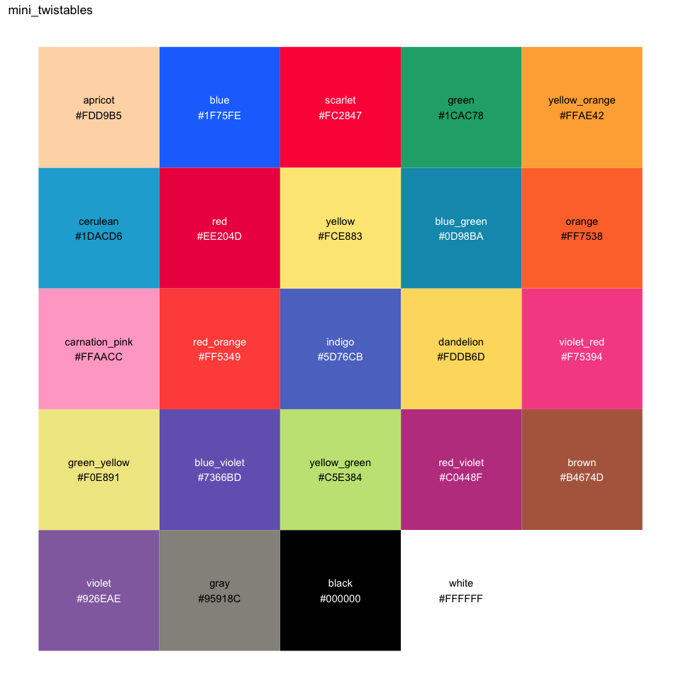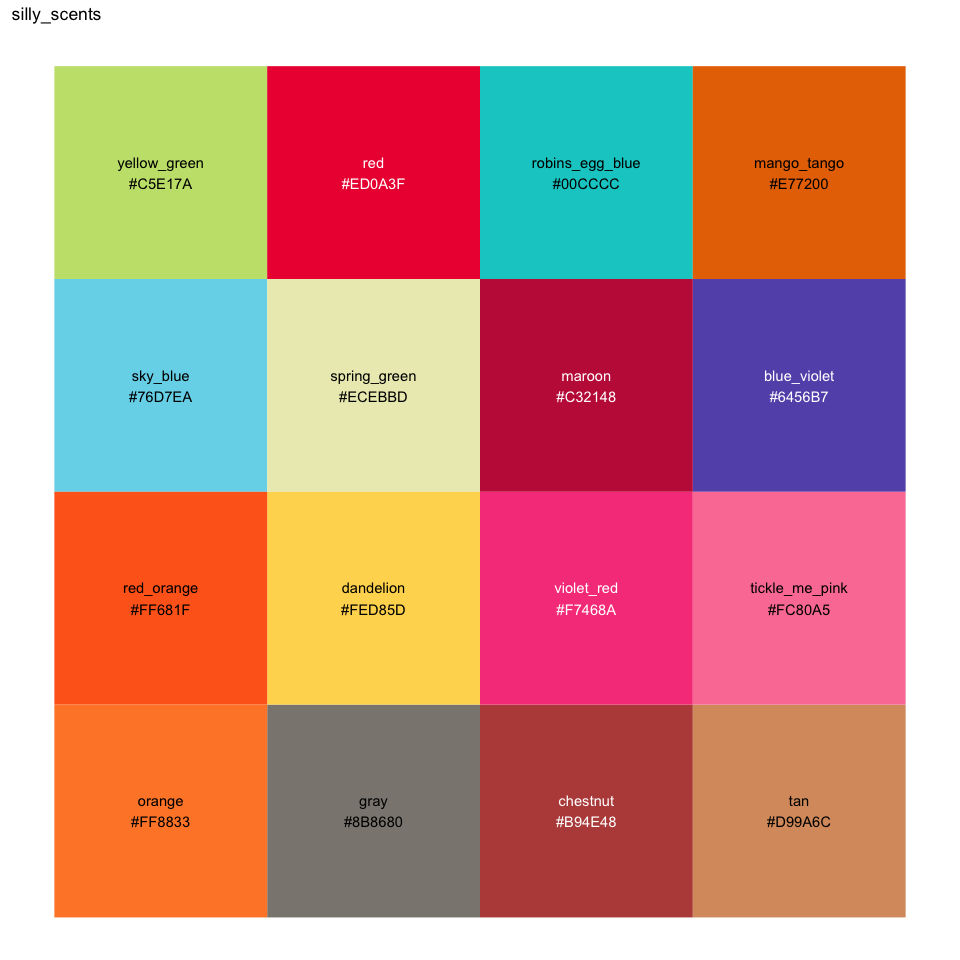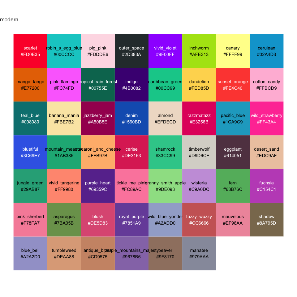 crayons provides crayon-based color palettes. For nostalgic uses, consider combining with ggrough or roughsf.