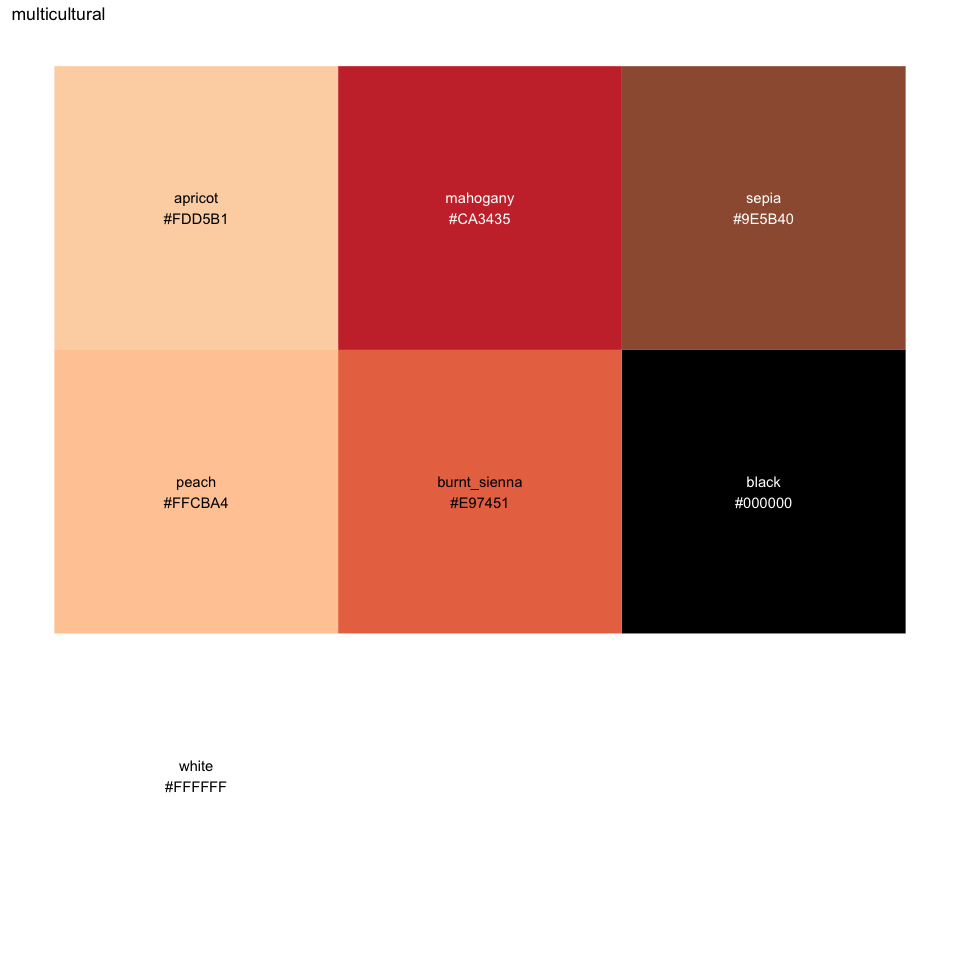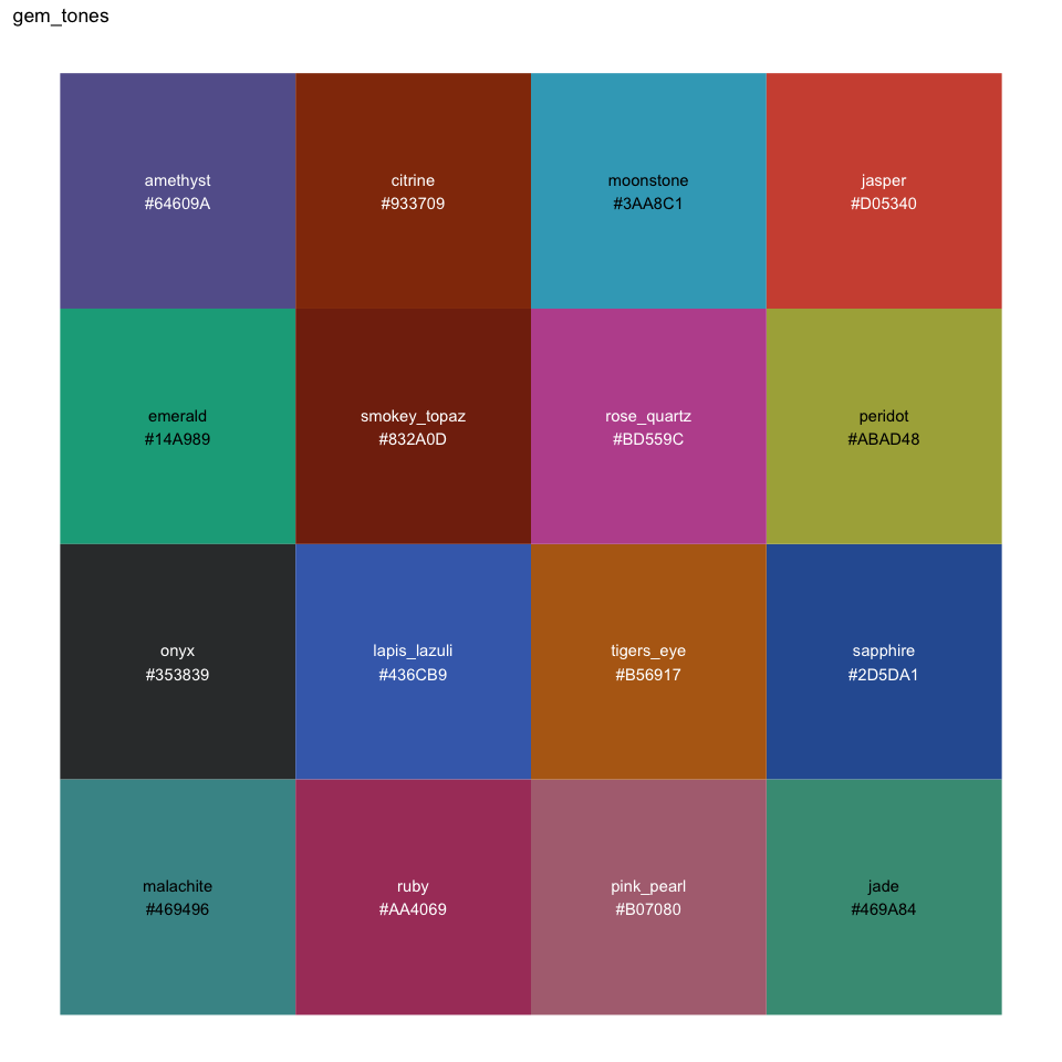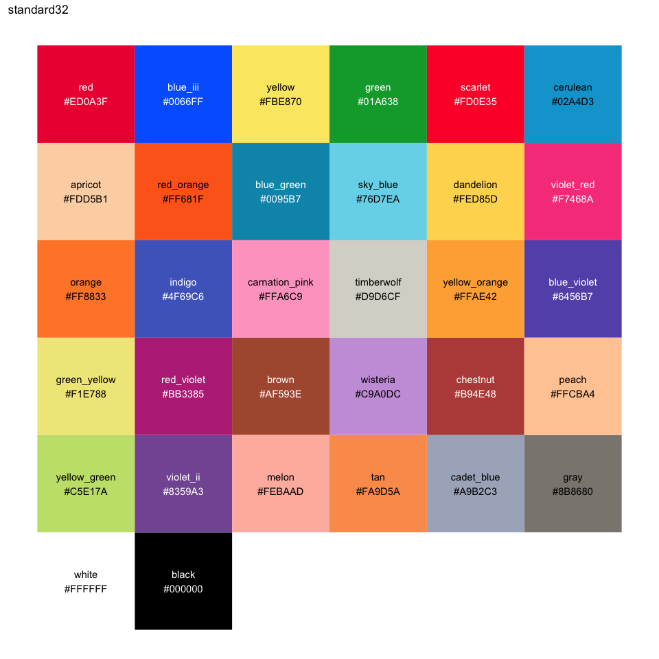 These palettes are not necessarily (and unlikely to be) color-blind friendly. For public-facing work, consider a color-blind friendly package, such as Cory McCartan’s wacolors.