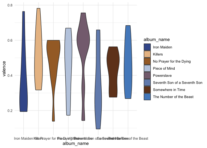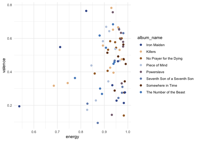 Inspired by the rockthemes package and adapting code form that package I have come up with a bunch of colour themes based around the studio albums of my favourite band Iron Maiden. Full disclosure, I’m not a designer, so this largely involved uploading images of their sleeves to colorpalettefromimage.com and seeing what happened. If you have a better palette design send me the hex codes for the colours! If you’re wondering why some albums are missing, here’s the explanation: X Factor (would basically be 8 shades of gray), Fear of the Dark (shit album), The Book of Souls (would basically be 8 shades of black).