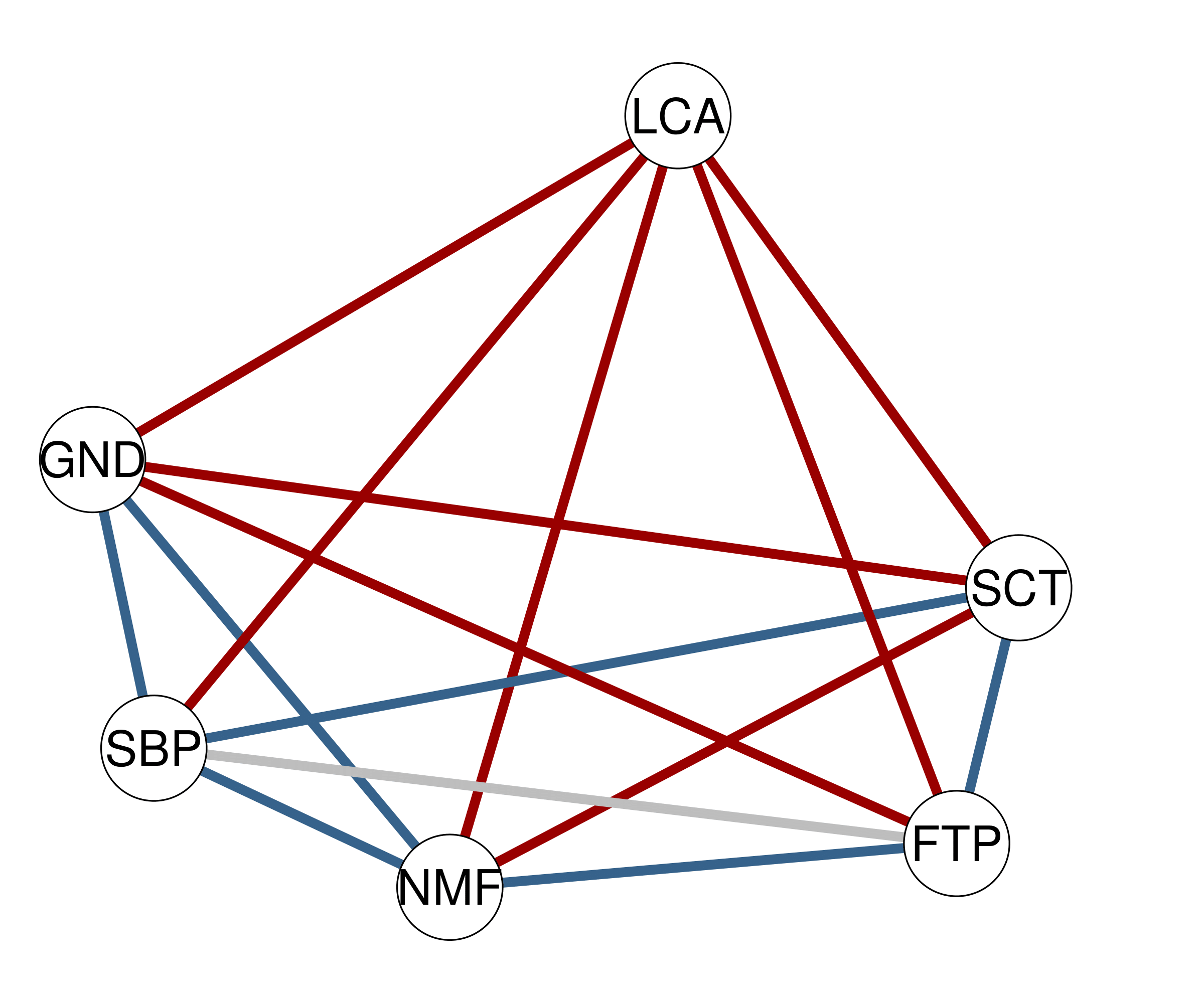 The edge evidence plot aids researchers in deciding which edges provide robust inferential conclusions. In the edge evidence plot, edges represent the inclusion Bayes factor \(`\text{BF}_{10}`\). Red edges indicate evidence for edge absence (i.e., conditional independence), grey edges indicate the absence of evidence, and blue edges indicate evidence for edge presence (i.e., conditional dependence). By default, a \(`\text{BF}_{10} > 10`\) is considered strong evidence for inclusion and \(`\text{BF}_{01} > 10`\) for exclusion. Users can specify the threshold for Bayes factors.