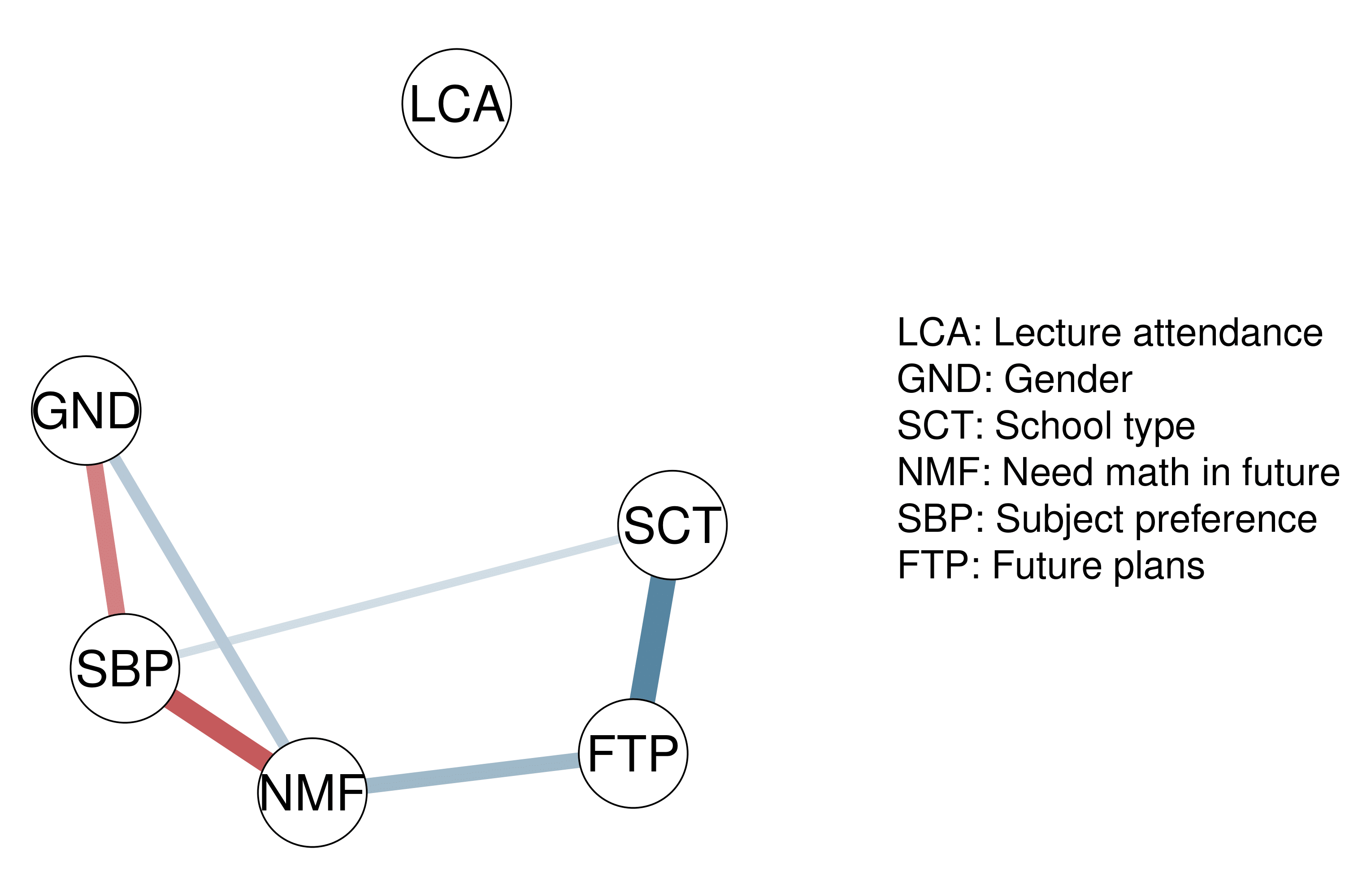 In the network plot, edges indicate the strength of partial association between two nodes. The network plot shows all edges with an inclusion Bayes factor greater than \(1\), i.e. all edges that have some evidence of inclusion. Edge thickness and saturation represent the strength of the association; the thicker the edge, the stronger the association. Red edges indicate negative associations and blue edges indicate positive associations.