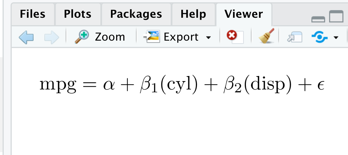 #> \operatorname{mpg} = \alpha + \beta_{1}(\operatorname{cyl}) + \beta_{2}(\operatorname{disp}) + \beta_{3}(\operatorname{hp}) + \beta_{4}(\operatorname{drat}) + \beta_{5}(\operatorname{wt}) + \beta_{6}(\operatorname{qsec}) + \beta_{7}(\operatorname{vs}) + \beta_{8}(\operatorname{am}) + \beta_{9}(\operatorname{gear}) + \beta_{10}(\operatorname{carb}) + \epsilon