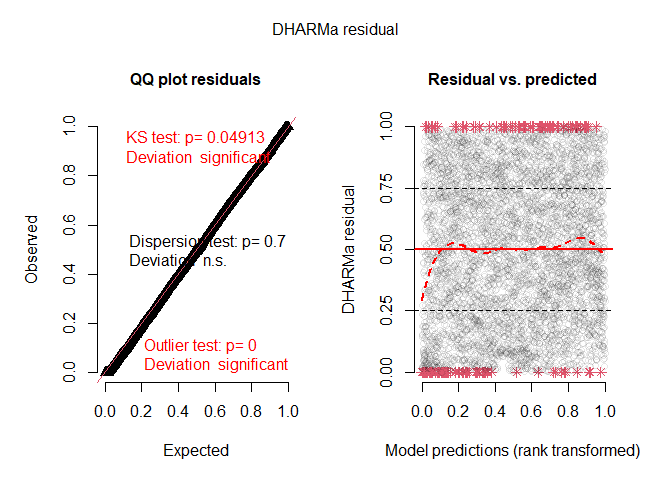 #> DHARMa:testOutliers with type = binomial may have inflated Type I error rates for integer-valued distributions. To get a more exact result, it is recommended to re-run testOutliers with type = 'bootstrap'. See ?testOutliers for details