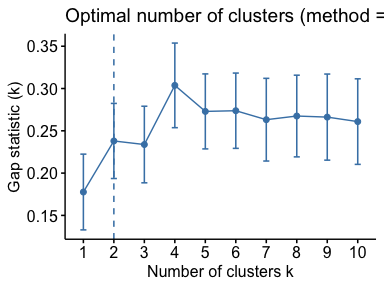| fviz_nbclust(fviz_gap_stat) | Determining and Visualizing the Optimal Number of Clusters. |