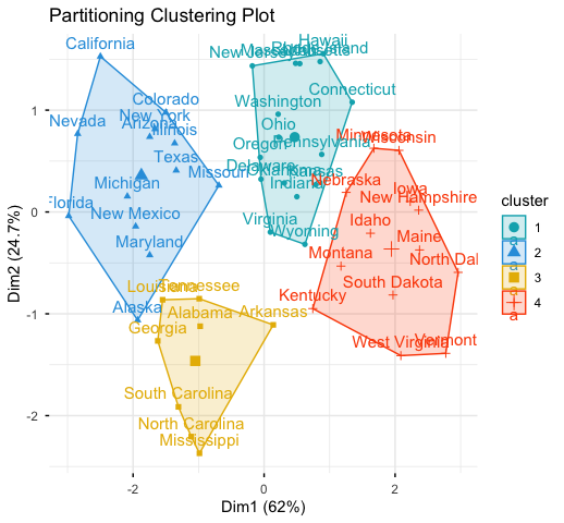 km.res <- kmeans(scale(USArrests), 4, nstart = 25)