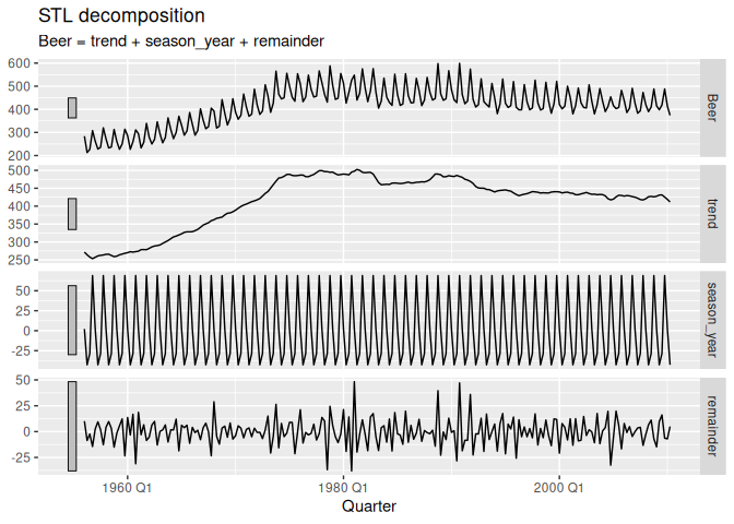 #> 4 STL(Beer ~ season(window = Inf)) 1956 Q4 308 253. 69.0 -14.4 239.