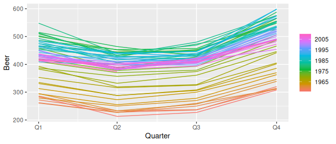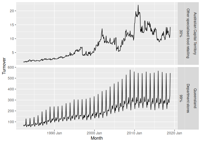 library(lubridate)Visualisation is often the first step in understanding the patterns in time series data. The package uses ggplot2 to produce customisable graphics to visualise time series patterns.