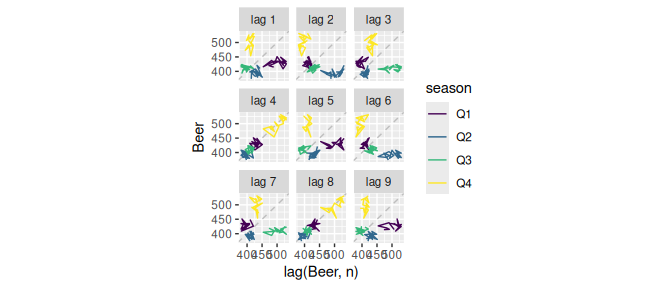 aus_production %>% filter(year(Quarter) > 1991) %>% gg_lag(Beer)