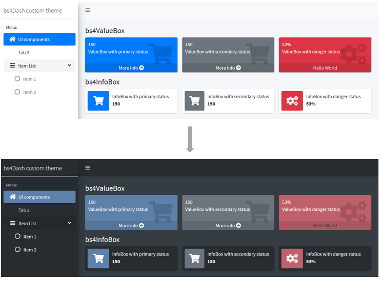 remotes::install_github("dreamRs/fresh")Create a theme to personalize your {bs4Dash} applications: