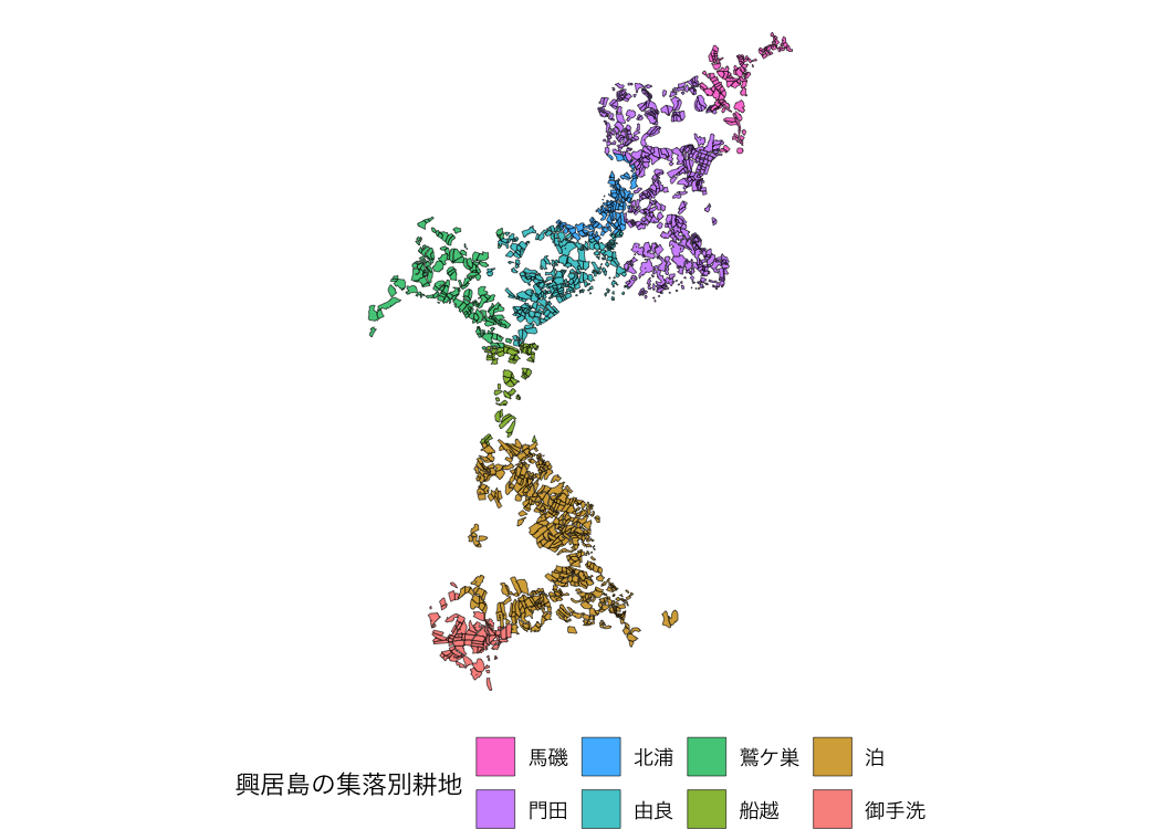 guides(fill = guide_legend(reverse = TRUE, title = "興居島の集落別耕地")) +