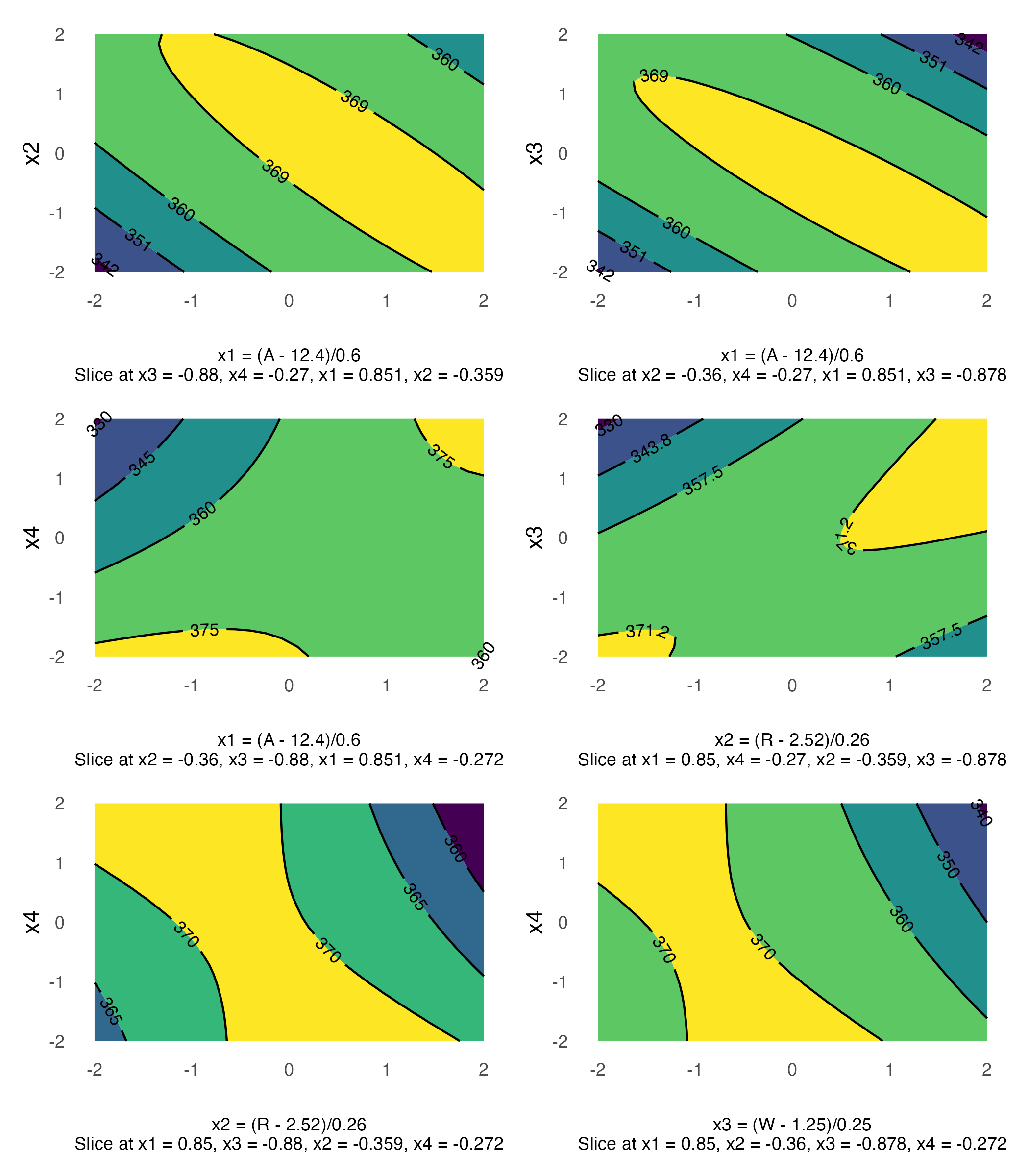 contour plot(s) that display the fitted surface for an rsm object involving two or more numerical predictors