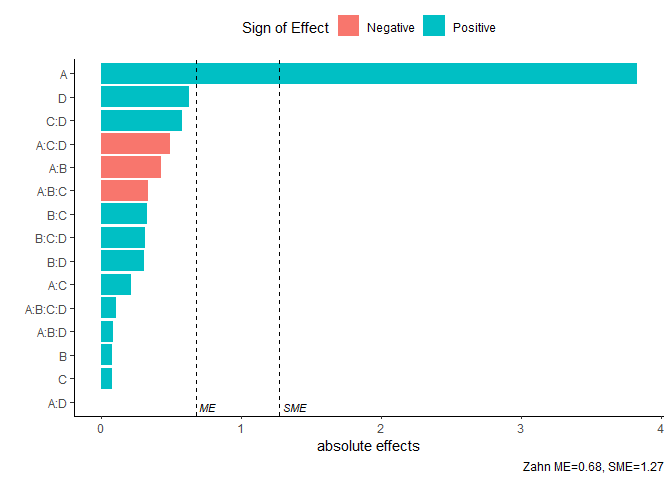 Pareto plot of effects with cutoff values for the margin of error (ME) and simultaneous margin of error (SME)