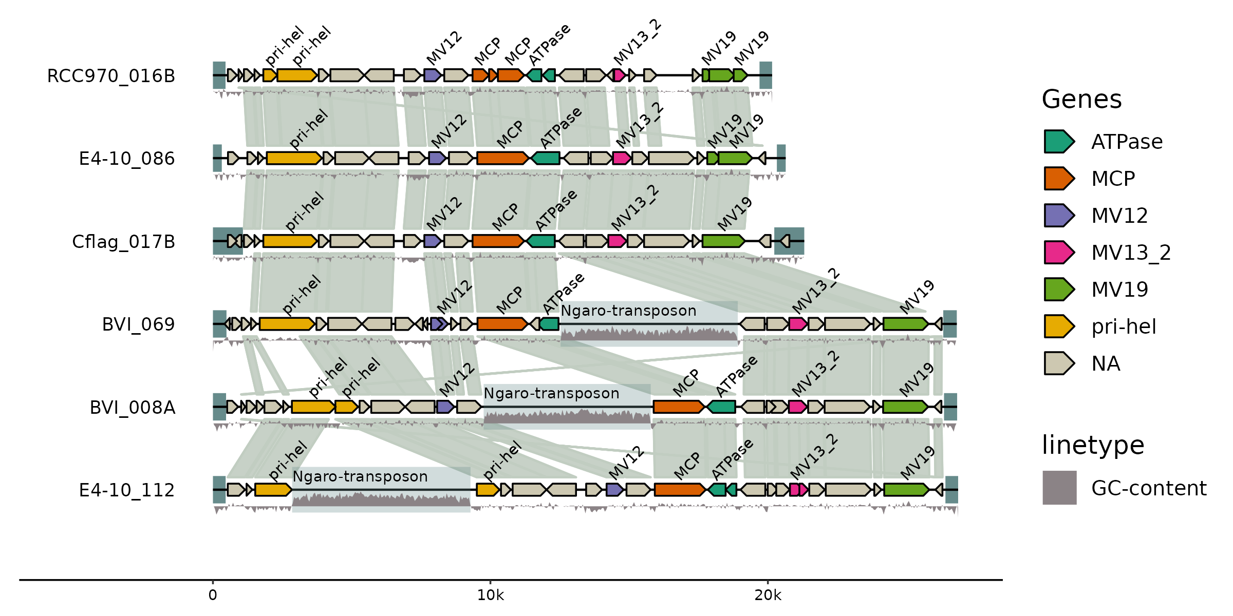 ggsave("emales.png", width=8, height=4)For a reproducible recipe describing the full evolution of an earlier version of this plot with an older version of gggenomes starting from a mere set of contigs, and including the bioinformatics analysis workflow, have a look at From a few sequences to a complex map in minutes.