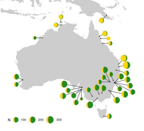 Pie chart maps are popular in population genetics, so let’s look at