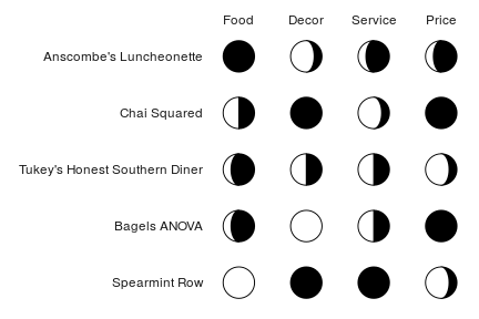 “Harvey balls” are essentially pie charts used for qualitative comparisons, often in tabular format. We can use moon charts for the same purpose.