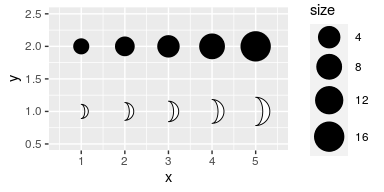 #> Loading required package: ggplot2ggplot(data.frame(x = 1:5, y = 1, size = 2^(0:4)), aes(x, y, size = size)) +