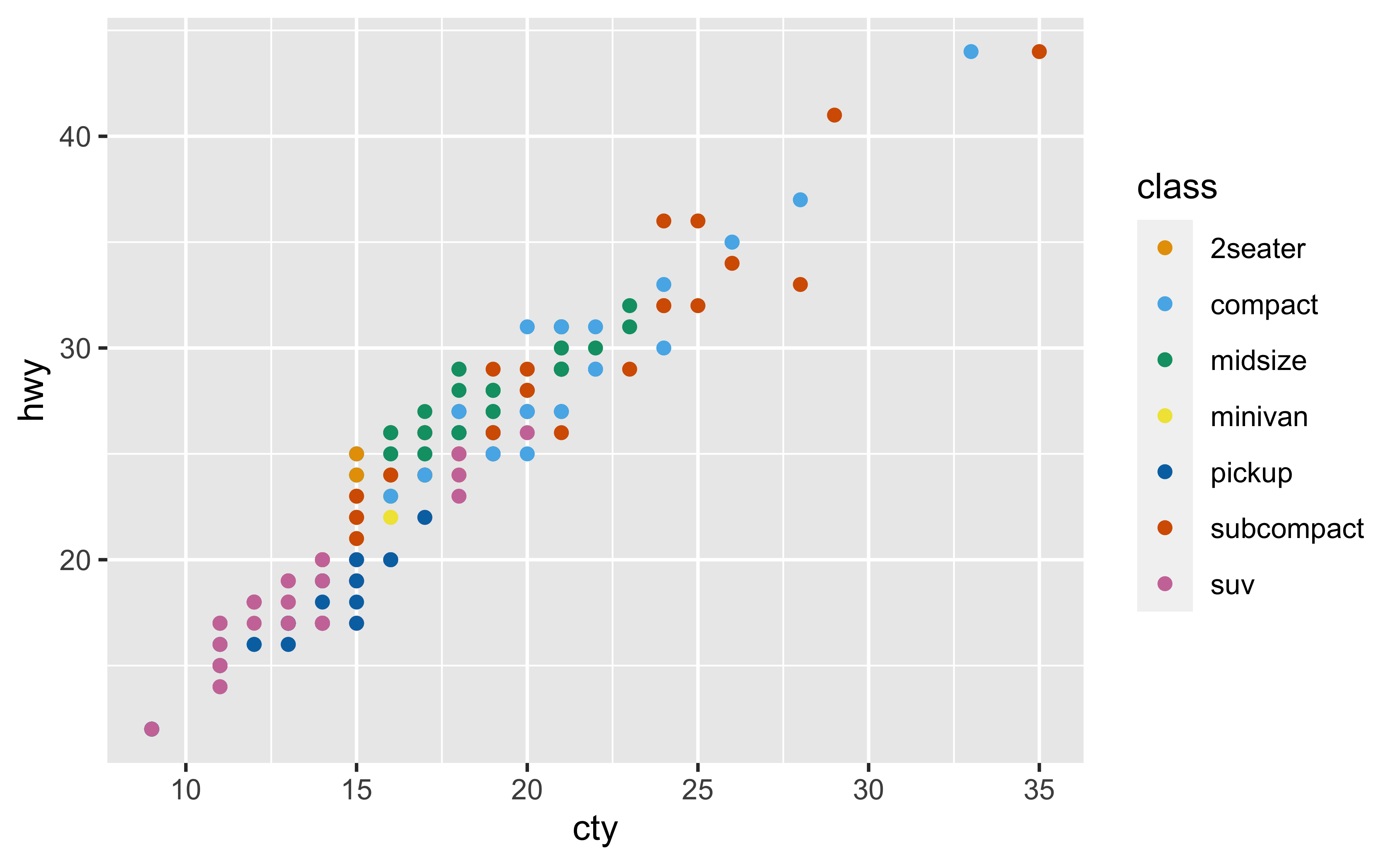 ggplot(mpg, aes(cty, hwy, color = class)) +