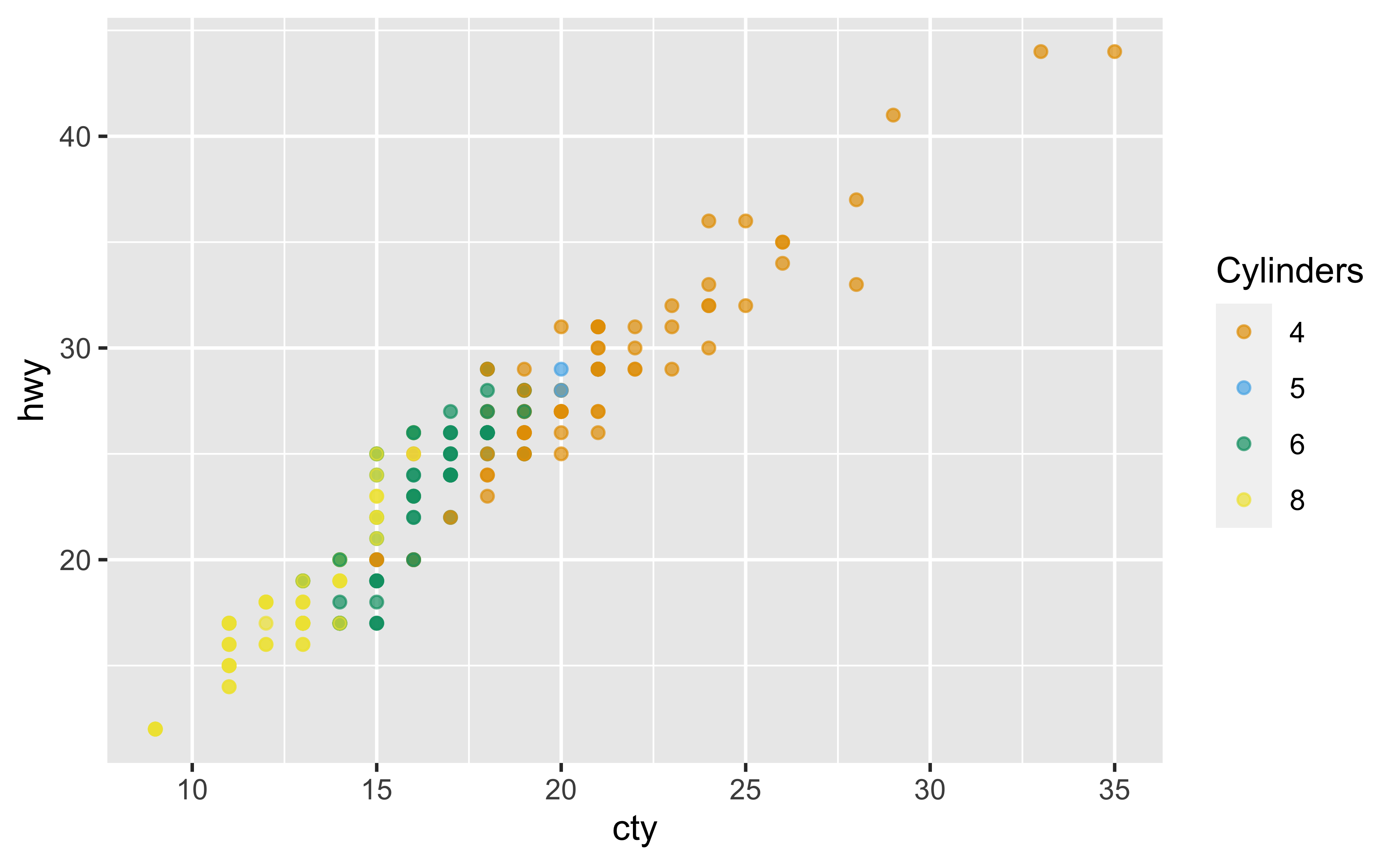 scale_color_okabe_ito(name = "Cylinders", alpha = .9)