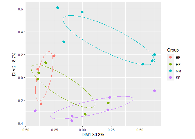 install.packages("ggordiplots")Plot an ordination with ellipses around treatment group centroids (at