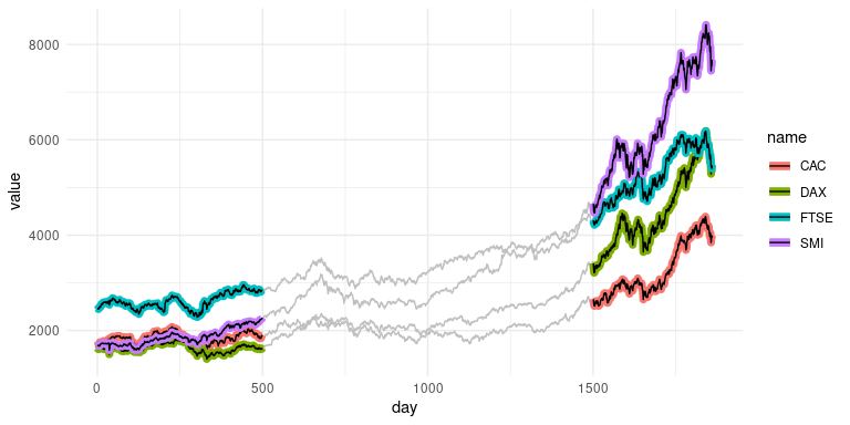 ggplot(stocks, aes(day, value, color = name)) +