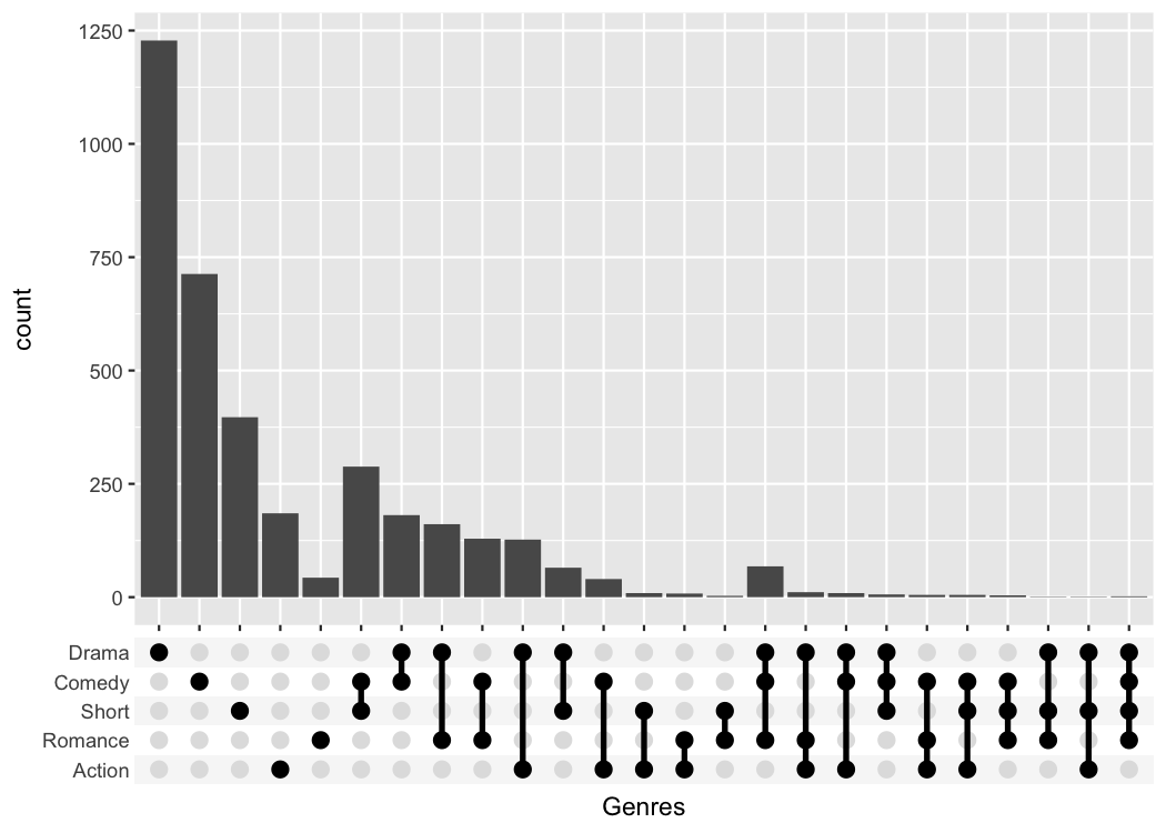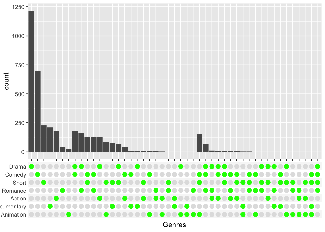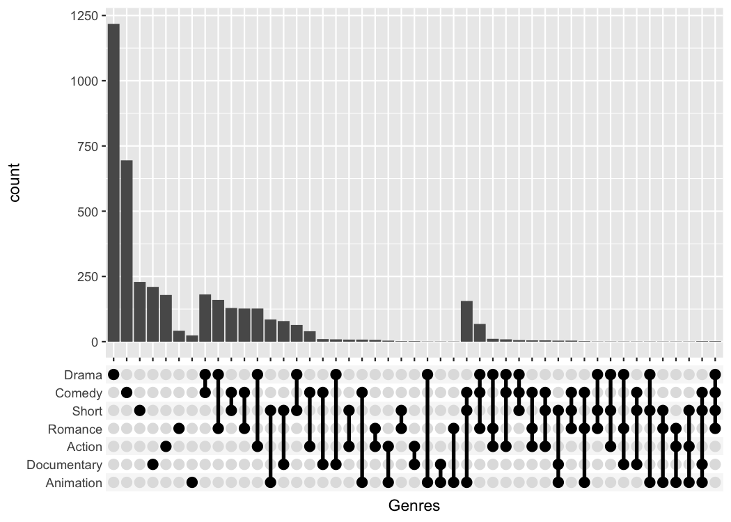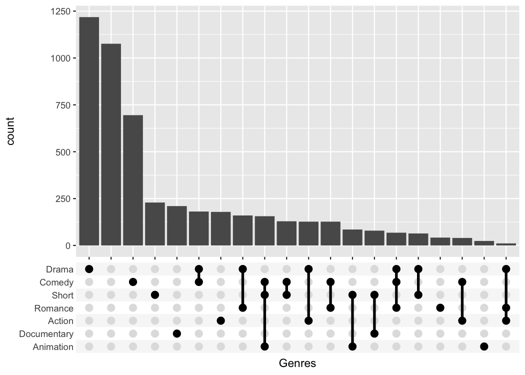 ggupset makes it easy to get an immediate impression how many movies are in each genre and their combination. For example there are slightly more than 1200 Dramas in the set, more than 1000 which don’t belong to any genre and ~170 that are Comedy and Drama.