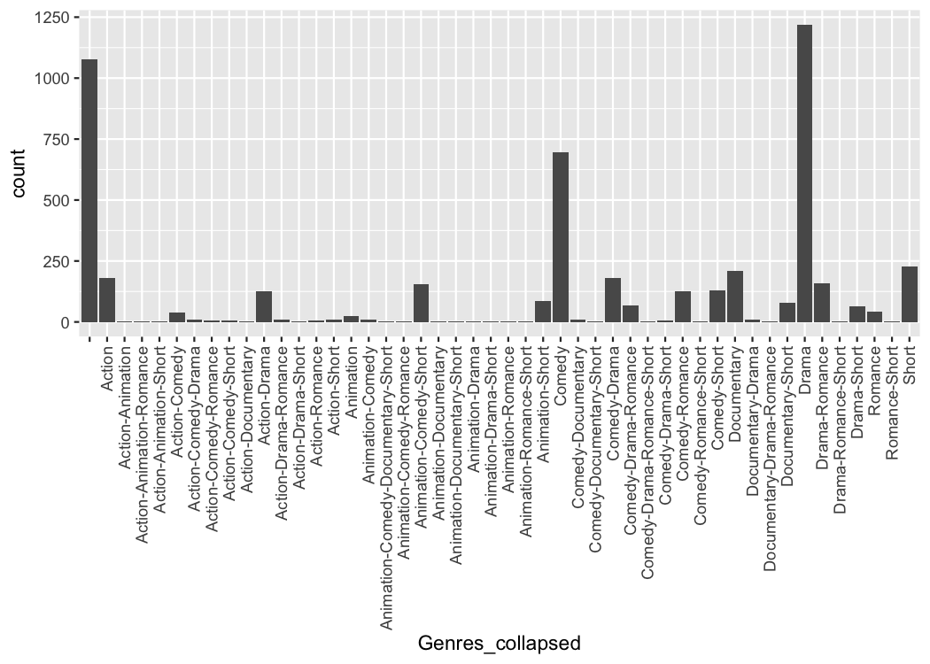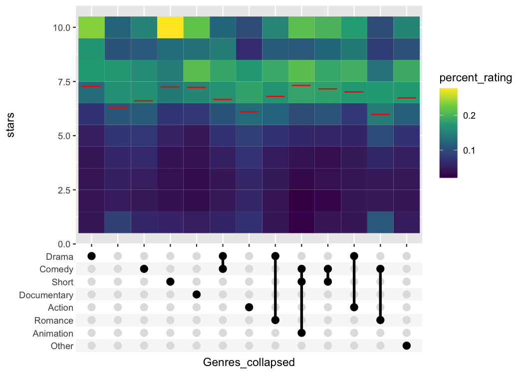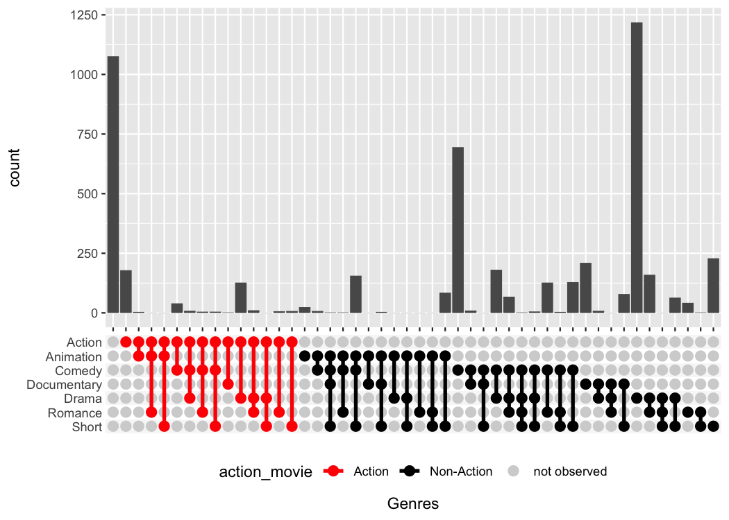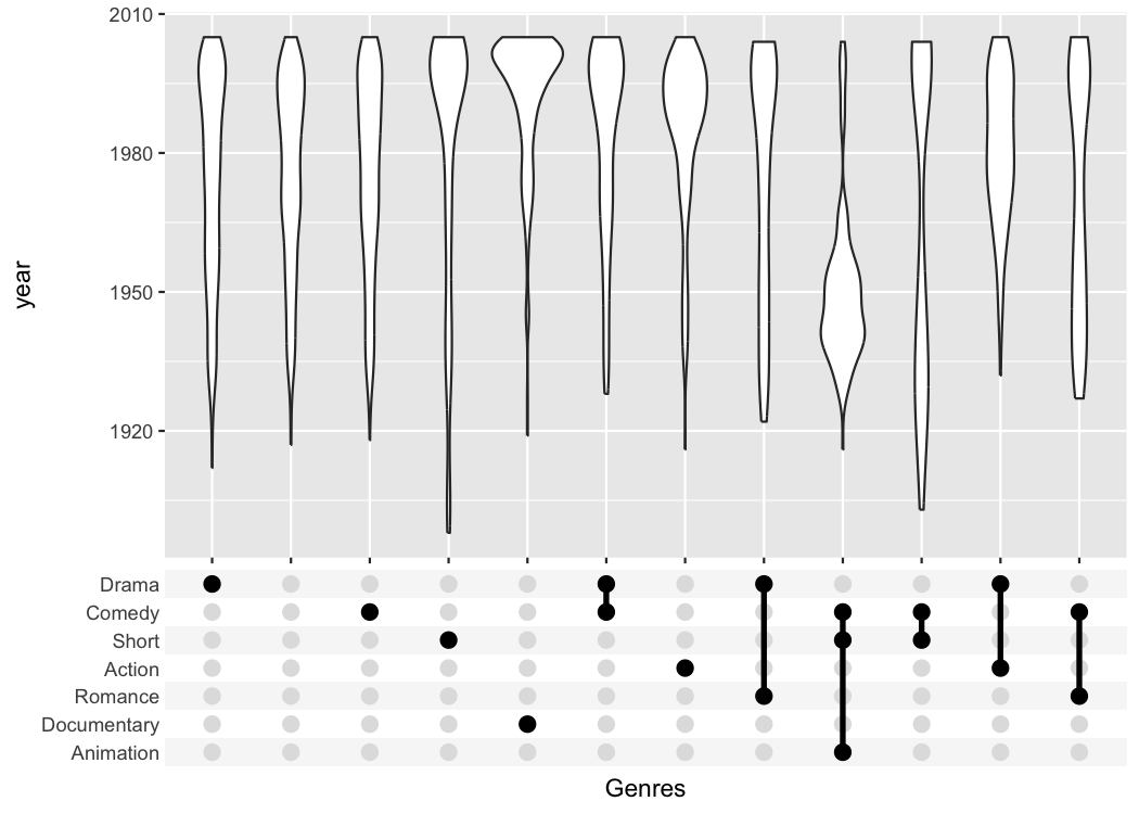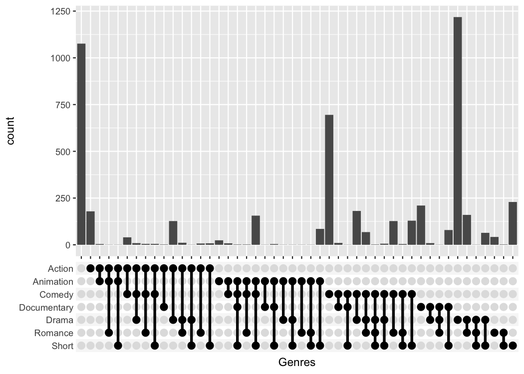 ggupset makes it easy to get an immediate impression how many movies are in each genre and their combination. For example there are slightly more than 1200 Dramas in the set, more than 1000 which don’t belong to any genre and ~170 that are Comedy and Drama.