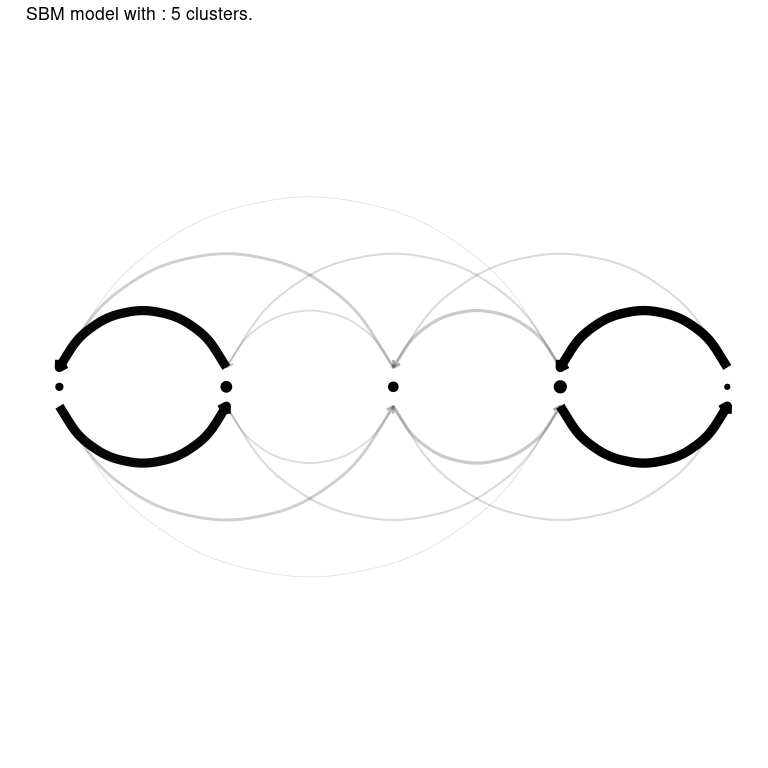 #> ── Clustering with a SBM model 5 clusters and an ICL of -1255The results of greed() is an S4 class which depends on